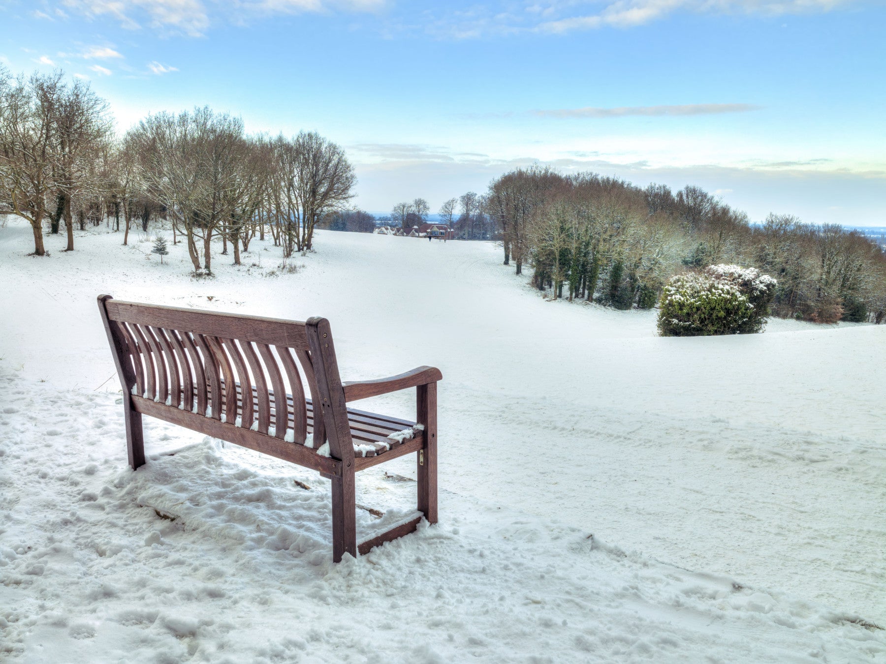 Outdoor bench, serene snowscape, beautiful winter vista wallpaper.