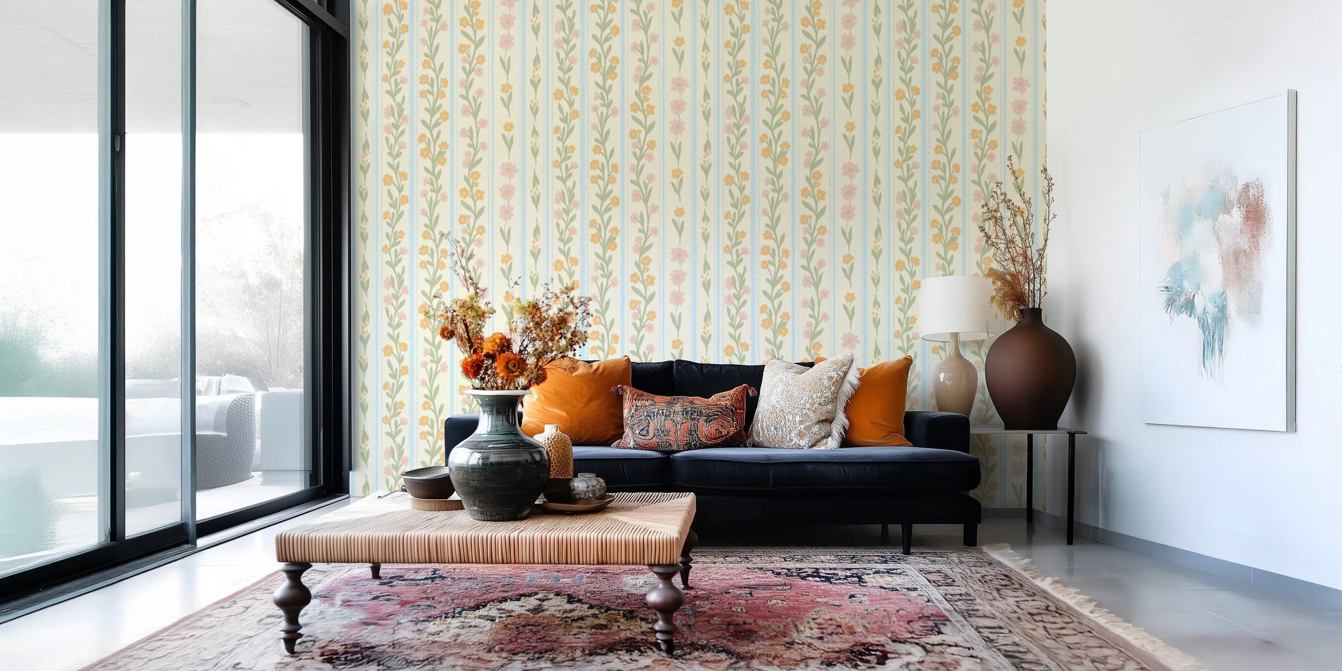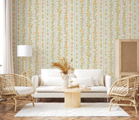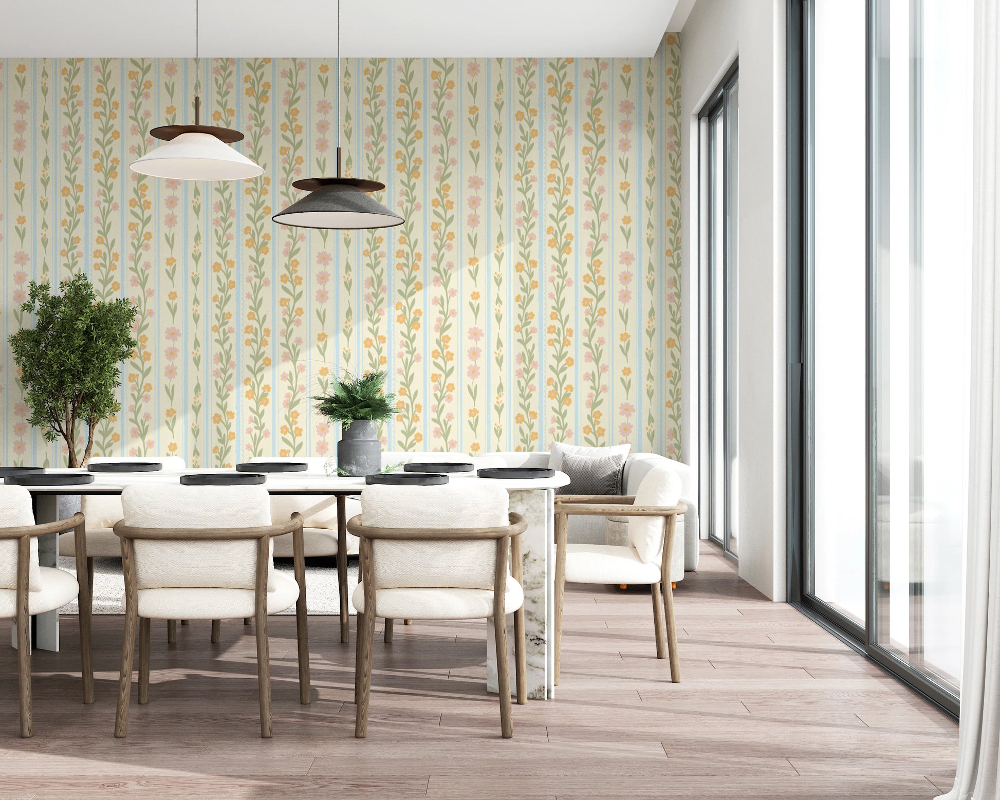 Sublimez votre intérieur avec ce papier peint élégant. Son motif floral harmonieux, composé de fleurs stylisées roses et jaunes, s'entrelace délicatement sur un fond de fines rayures, donnant ainsi une impression de hauteur à vos pièces. Des touches de bleu clair apportent une note de légèreté. Installez-le dans votre couloir pour créer une ambiance accueillante. Ses couleurs douces s'accordent parfaitement avec les chambres pour une atmosphère apaisante. Ce papier peint allie sérénité et originalité, transformant vos murs en éléments décoratifs vibrants. Son charme discret en fait le choix idéal pour toutes les pièces de la maison.