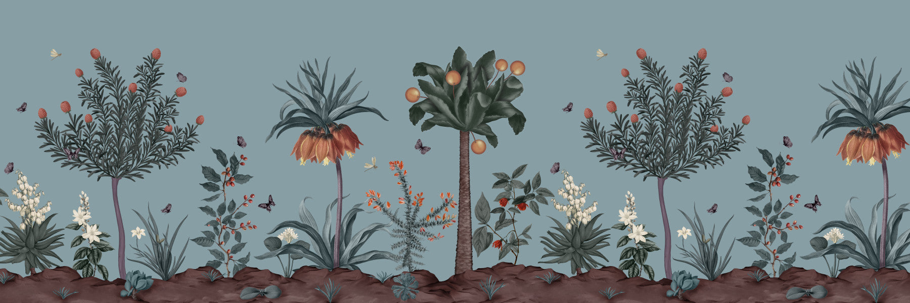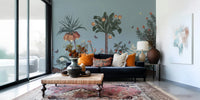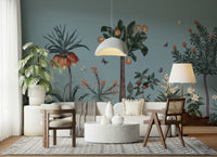 Transform any room with this serene botanical wallpaper for walls. The design presents a meticulously crafted landscape, filled with stylized trees, unique blossoms, and delicate butterflies against a muted blue background. Its earthy tones and sophisticated botanical illustration add a touch of organic elegance to your living room, bedroom, or hallway. The neutral color palette blends smoothly with various interior styles, enhancing spaces with a calm and sophisticated ambiance. Invite the tranquility of nature into your home with this refined botanical design.