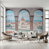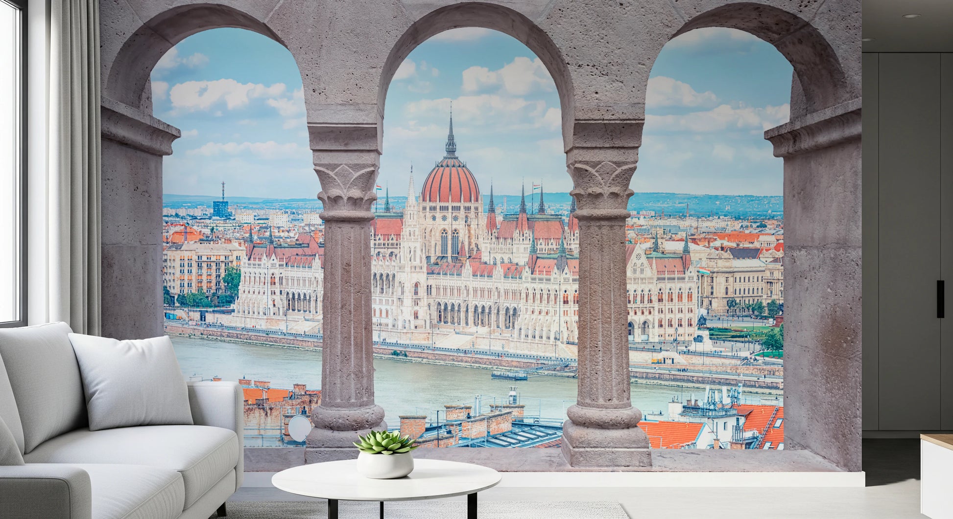 Transformez votre espace avec cette vue de Budapest à travers des arches de pierre, un papier peint idéal pour vos murs. Son motif apporte une touche architecturale et une sensation d'espace à n'importe quelle pièce. Les tons bleu pâle et crème créent un fond serein, tandis que le dôme rouge ajoute une note de couleur. Ce papier peint s'harmonise avec les intérieurs traditionnels et modernes, et convient parfaitement aux salons, salles à manger ou couloirs. Il apporte profondeur et caractère, transformant des murs ordinaires en points focaux exceptionnels.