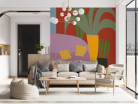 Transformez votre espace avec ce charmant papier peint mural qui évoque une ambiance chaleureuse et un style fantaisiste. Son motif met en scène des rayures audacieuses, des plantes en pot espiègles et deux chats prélassés. Une palette de couleurs vives, composée de bleus clairs, de rouges corail et de violets pastel, crée une atmosphère accueillante et conviviale. Ce papier peint illumine les chambres d'enfants, les pièces à vivre et même les bureaux créatifs. Son motif fantaisiste apporte du caractère à vos murs, rendant chaque pièce plus accueillante et chaleureuse. Idéal pour ajouter une touche de légèreté à votre intérieur.