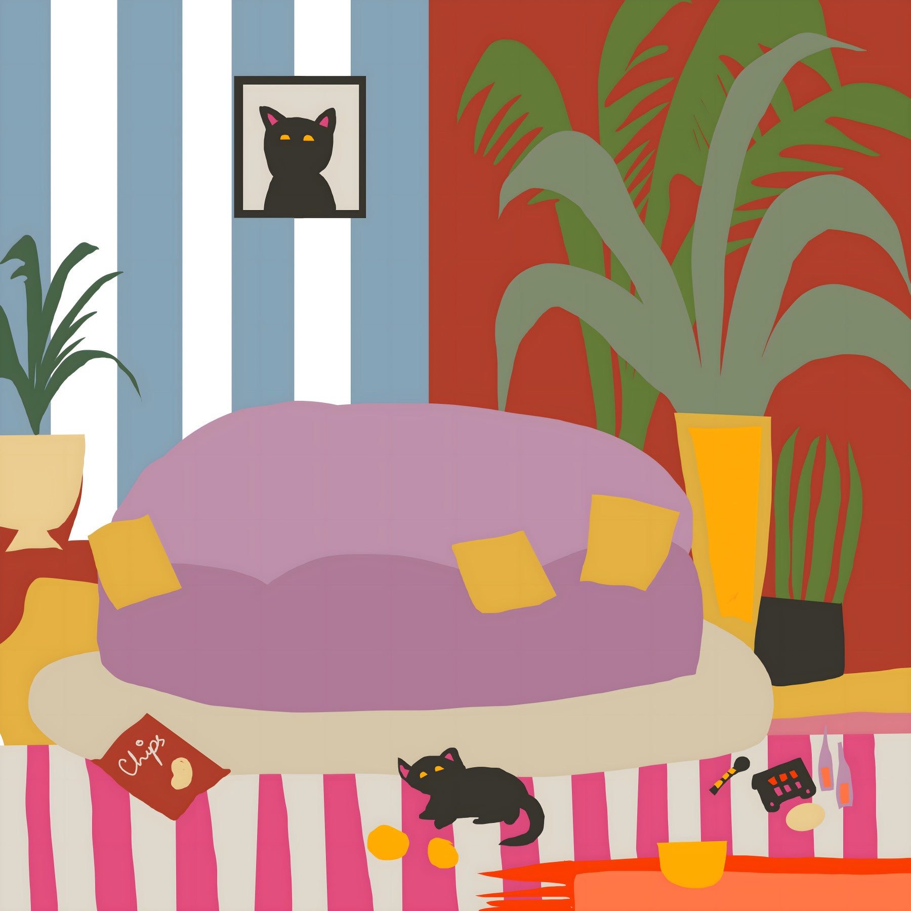Peinture murale rayée « Vie de chat confortable » pour le salon