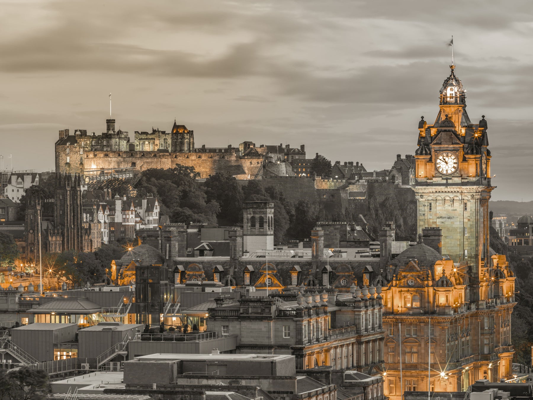 Monochrome Edinburgh Twilight with color pop, beautiful urban wallpaper.