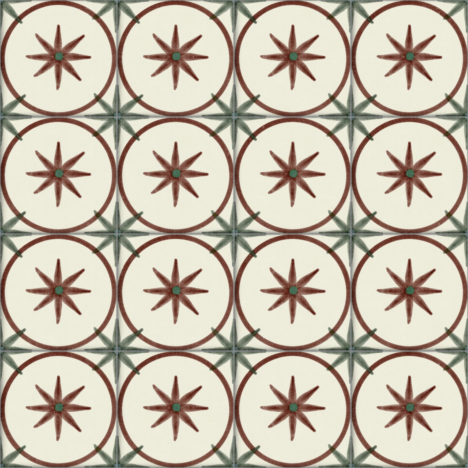Laissez-vous charmer par l'authenticité d'antan avec cette crédence murale en argile au style champêtre intemporel. D'une élégance rustique, son motif ravissant évoque les carreaux peints à la main d'autrefois. Des tons chauds et terreux de brun rougeâtre forment des cercles qui renferment des étoiles stylisées, chacune ornée d'un petit centre vert, sur un fond blanc cassé crémeux. Les textures subtiles imitent le toucher de l'argile véritable, apportant une touche de chaleur organique à votre intérieur. Des détails entrecroisés d'un vert doux ajoutent une note complémentaire, renforçant le charme vintage de l'ensemble. Ce motif est idéal pour insuffler une ambiance champêtre et chaleureuse à votre cuisine, votre salle de bain ou toute autre pièce en quête d'une esthétique intemporelle. Il évoque un sentiment d'héritage et de confort douillet.