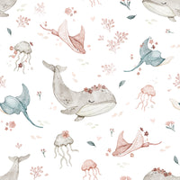 Plongez dans un monde sous-marin serein avec ce papier peint enchanteur. De délicates illustrations aquarelles représentent des baleines gracieuses ornées de couronnes florales, aux côtés d'élégants raies de pichons et de méduses fantaisistes, tous nageant au milieu d'une dispersion de fleurs rose et de pêche doux et de feuillage de mer délicat. La palette de couleurs apaisante et les conceptions de personnages charmantes créent une atmosphère paisible et rêveuse, parfaite pour ajouter une touche d'élégance fantaisiste à n'importe quel espace. Ce fond d'écran est un beau mélange de vie marine et d'art floral, idéal pour ceux qui apprécient une touche de magie et de tranquillité dans leur décoration intérieure.