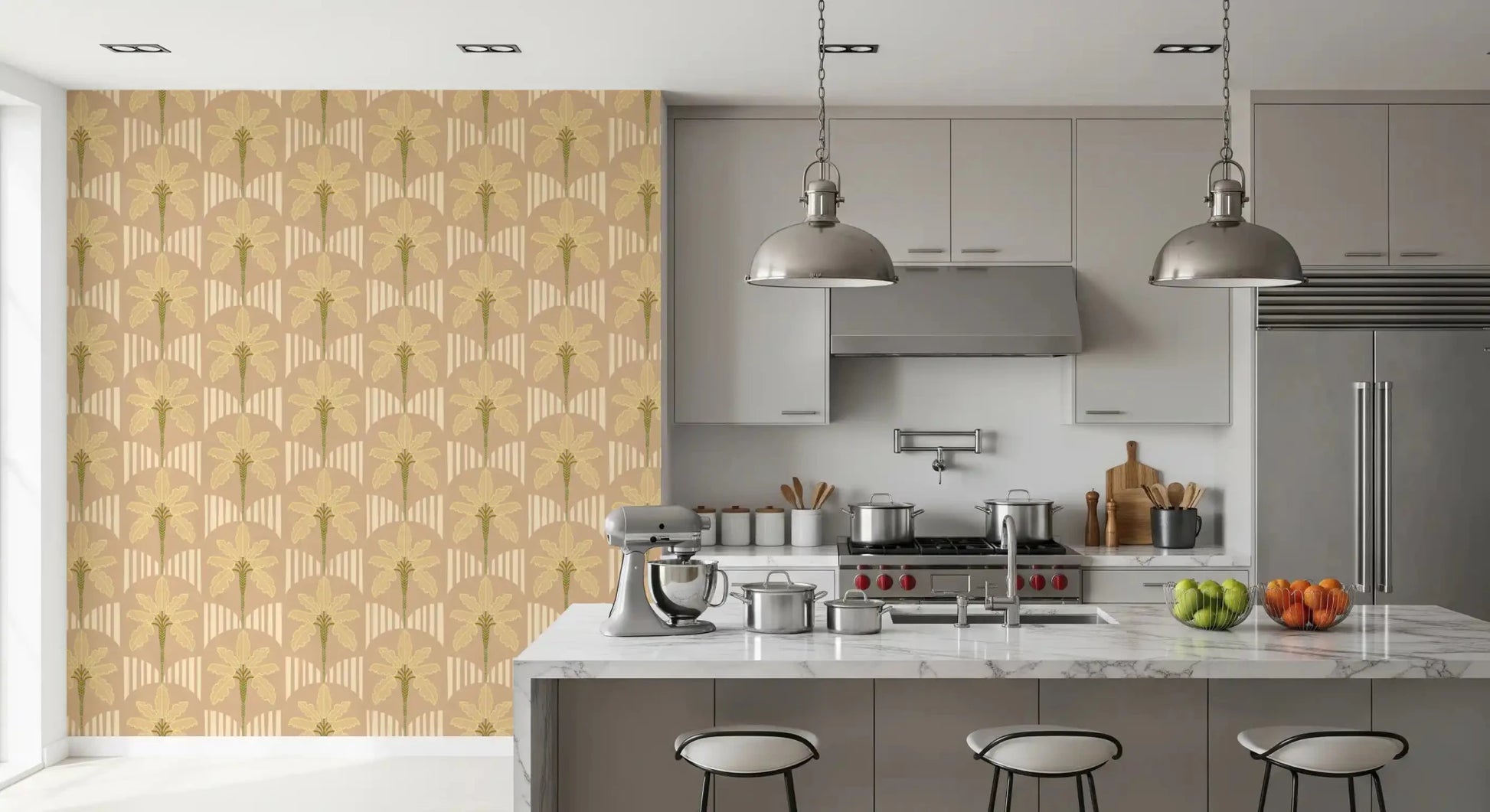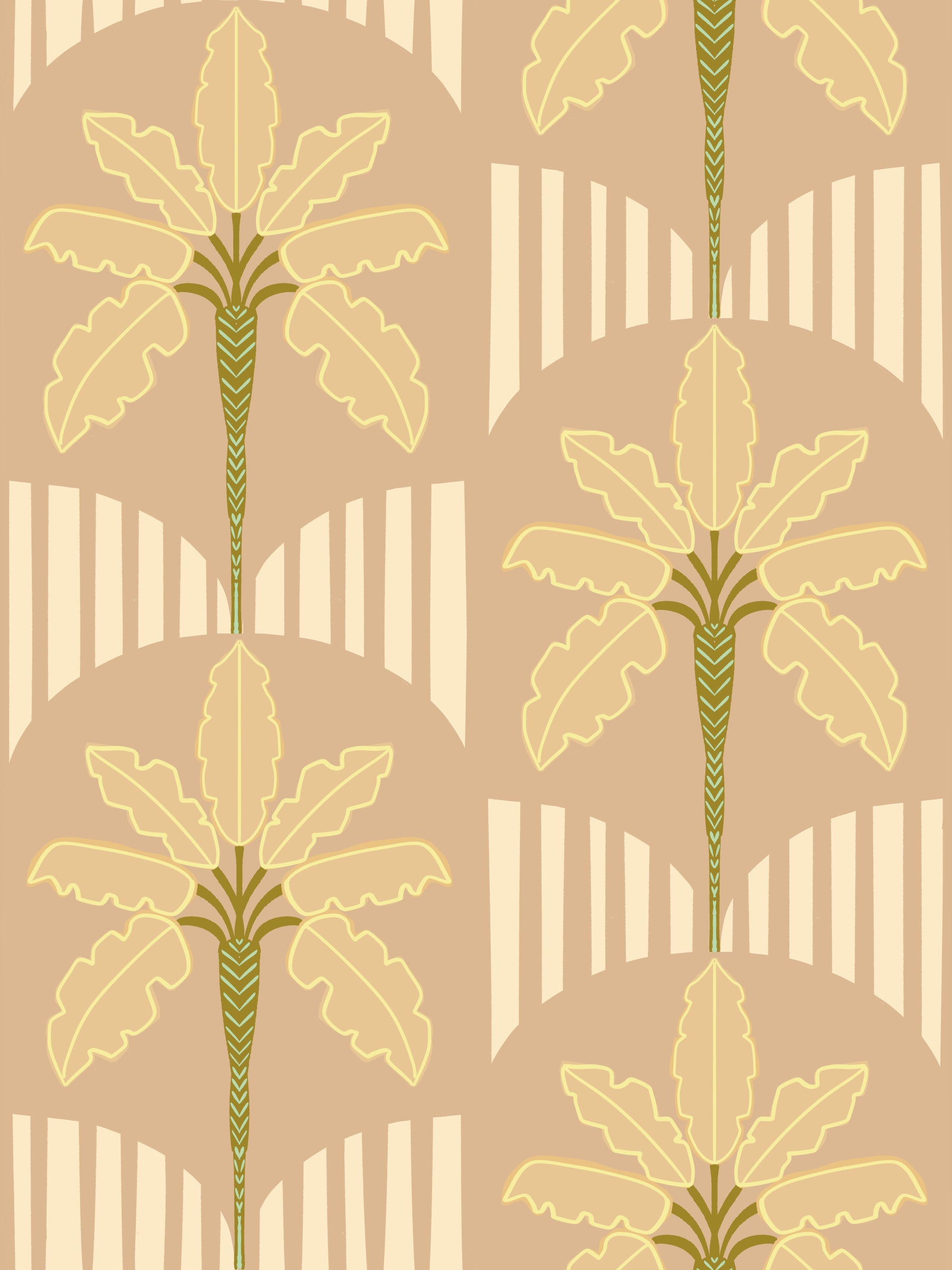 Ce papier peint unique apporte une touche botanique sereine et rétro à tout intérieur. Son motif met en scène des bananiers stylisés, aux lignes douces et fluides, ornés d'élégants chevrons sur leurs fines tiges. Une palette de couleurs douces se compose d'un fond beige pêche chaleureux, rehaussé de feuilles jaune crème soulignées d'un subtil liseré doré et de riches accents vert olive. Des éléments arqués et rayés créent un contraste géométrique subtil, ajoutant de la profondeur au motif. Ce papier peint polyvalent embellit les salons, les chambres ou les salles à manger, créant une atmosphère accueillante et paisible. Il convient également parfaitement à une chambre d'enfant ou un bureau, insufflant aux espaces une chaleur naturelle et une ambiance tropicale discrète.