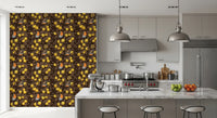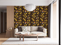 Rouges-gorges dans le pommier / Papier peint jaune et marron foncé