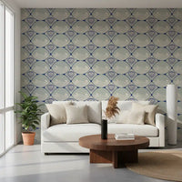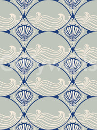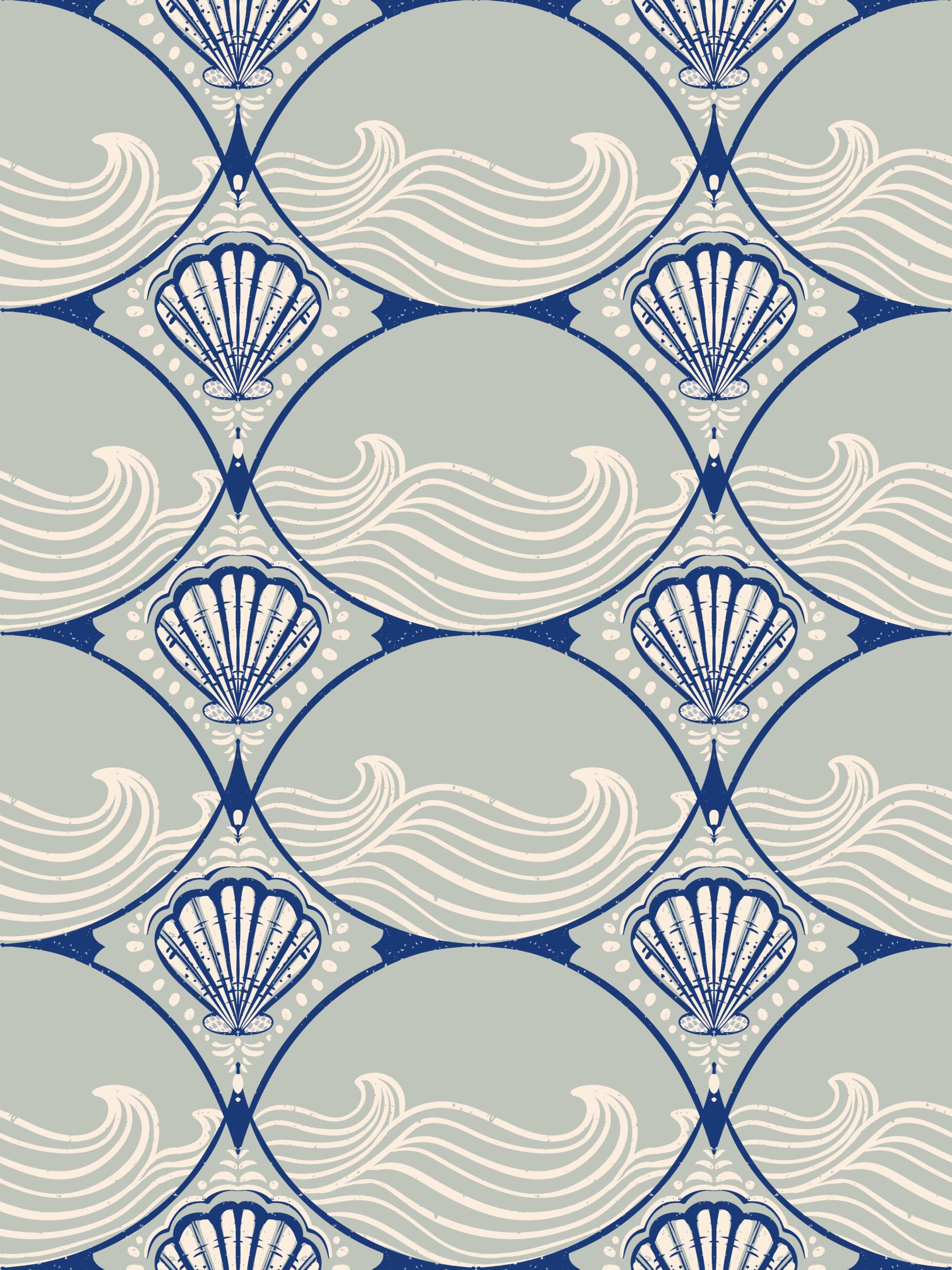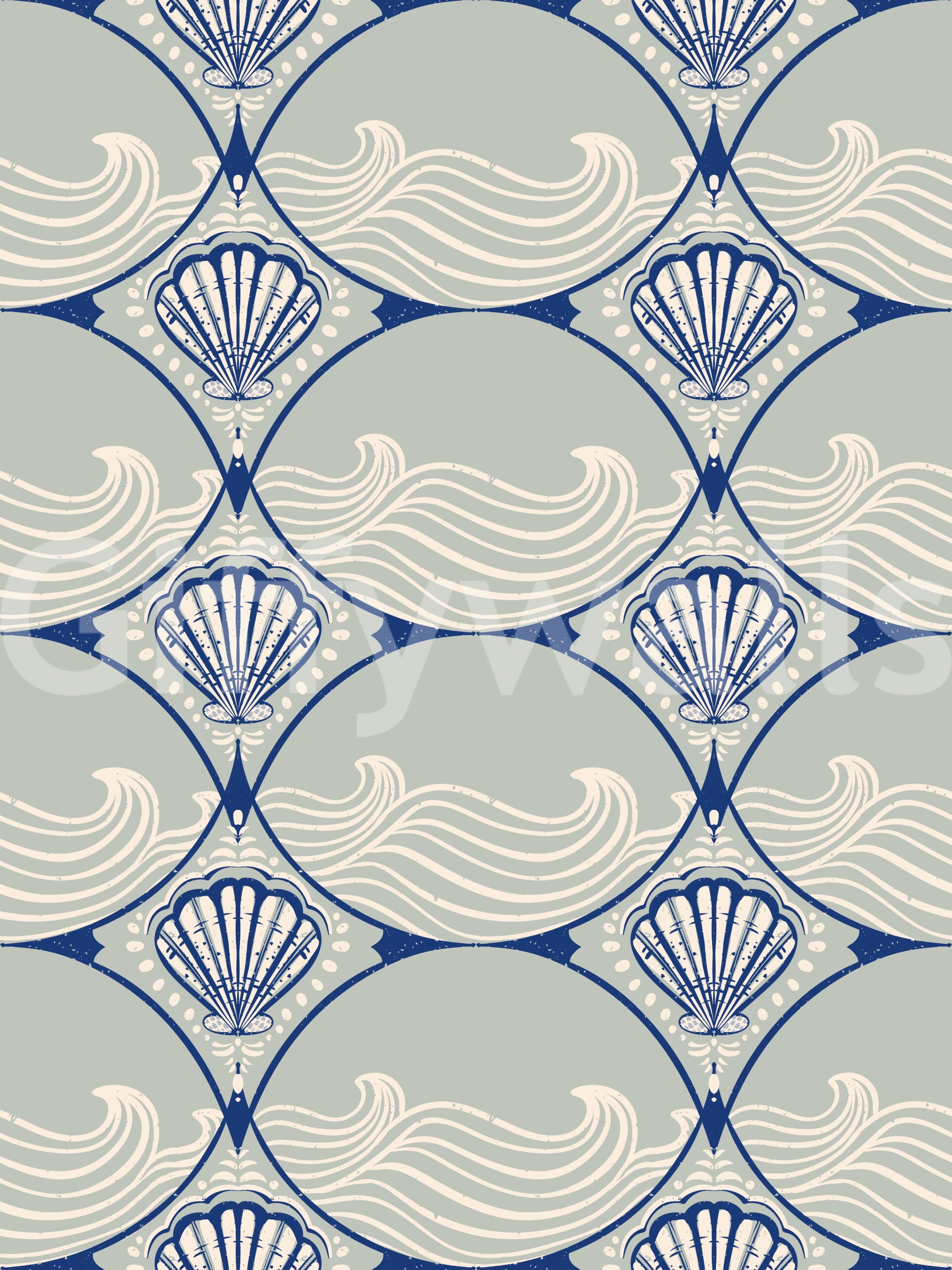 Transformez votre intérieur avec ce papier peint captivant à motif de coquillages. Son design élégant présente un motif répétitif de coquilles Saint-Jacques stylisées, délicatement encadrées de formes courbes, évoquant une esthétique Art déco sophistiquée et une ambiance côtière rafraîchissante. De douces vagues ondulantes animent le fond, insufflant un mouvement dynamique à cette composition sereine. Une palette de couleurs douces, composée de bleu marine profond, de vert sauge tendre et de blanc cassé crémeux, crée une atmosphère paisible et accueillante. La texture légèrement vieillie lui confère un charme vintage indéniable. Installez ce papier peint original dans votre salle de bain, votre salon, votre salle à manger ou votre chambre pour y insuffler une élégance marine intemporelle. Il sublime les intérieurs, offrant une sensation de calme et un style raffiné qui s'harmonise aussi bien avec un mobilier moderne que classique.