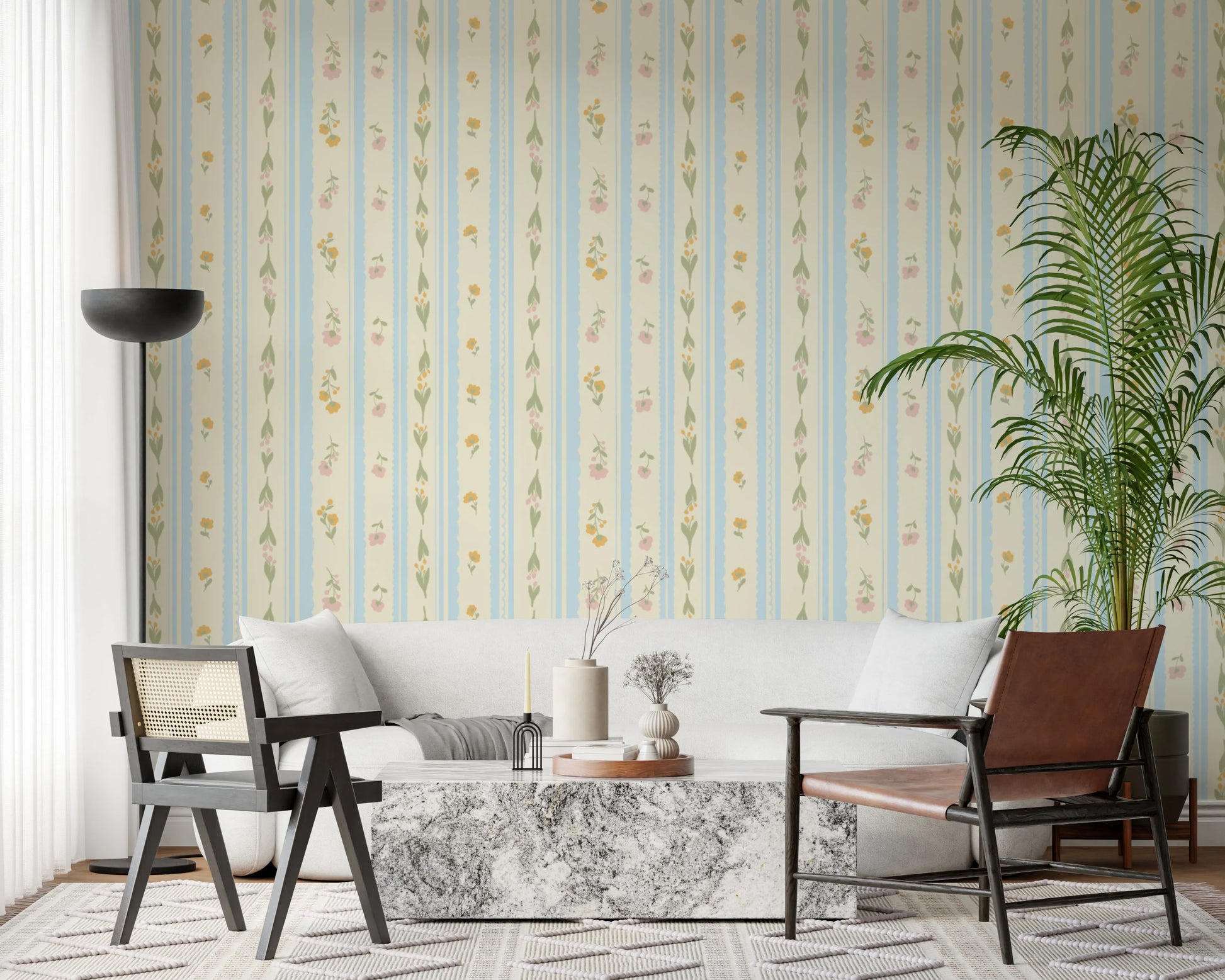 Embellissez votre intérieur avec ce charmant papier peint floral d'inspiration vintage. Son motif met en valeur de délicates fleurs aux tons roses et jaunes, gracieusement disposées entre des rayures verticales bleu ciel et de subtils détails en dentelle. La palette de couleurs douces crée une atmosphère sereine et accueillante, idéale pour les chambres, les chambres d'enfants ou les salles d'eau. Apportez une touche de nostalgie à votre cuisine ou salle à manger. Son style vintage confère aux pièces un charme intemporel et apaisant, créant des espaces à la fois modernes et familiers.