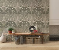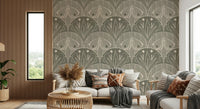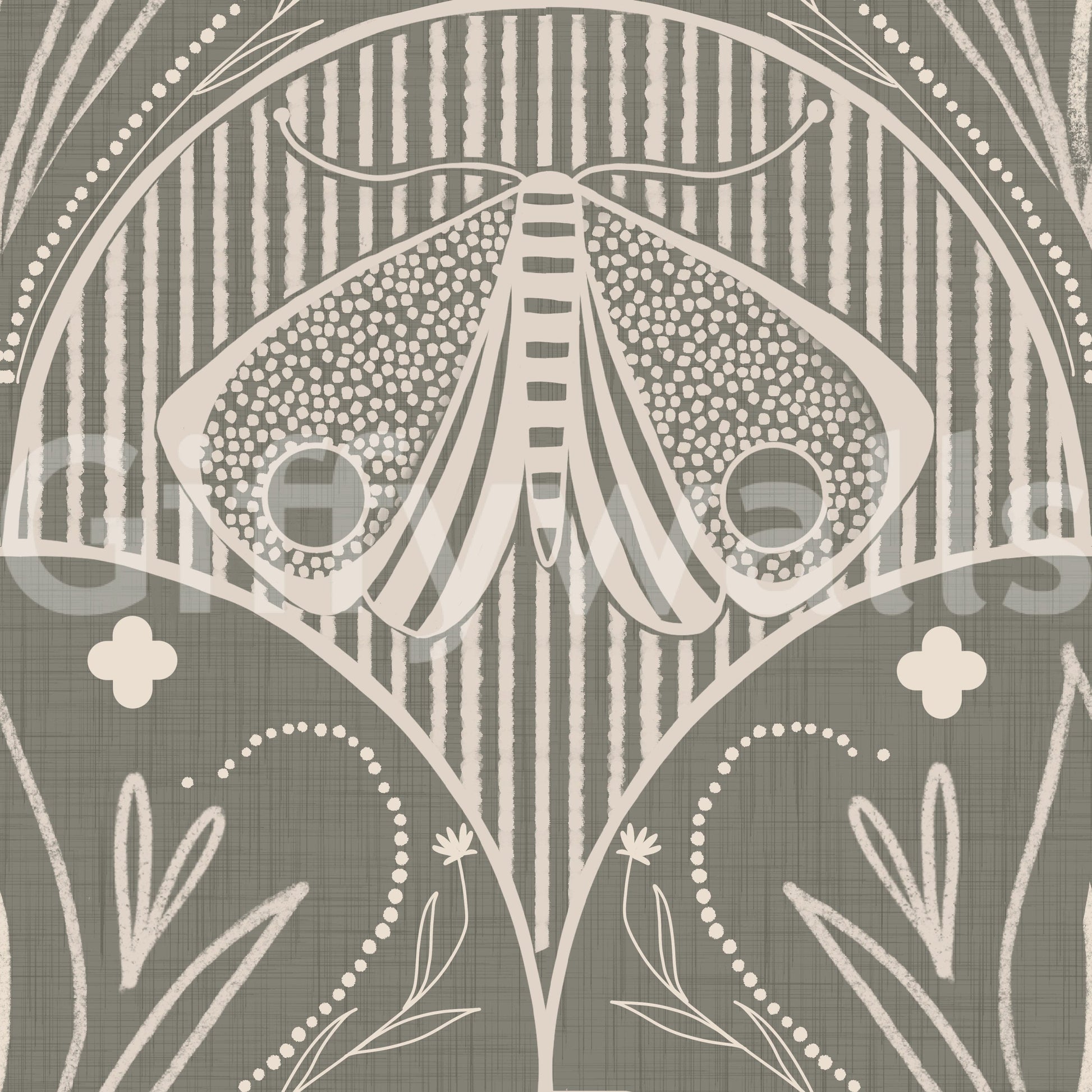 Embrace the serene beauty of our "Boho Art Nouveau Scallop Butterfly Floral" wallpaper. This design masterfully blends bohemian freedom with the structured elegance of Art Nouveau, rendered in a palette of warm taupe and gentle grey. A stylized moth/butterfly, the central motif, anchors the design with its intricate details and symmetrical composition. Scalloped arches and delicate floral accents, interspersed with dotted lines, surround the butterfly, evoking a sense of vintage charm and organic growth. The subtle, textured background adds depth and dimension, lending a tactile quality to this sophisticated pattern. Ideal for creating a calming and stylish ambiance in any room, this wallpaper brings a touch of nature-inspired artistry to your walls, perfectly capturing the essence of both the free-spirited boho aesthetic and the refined Art Nouveau movement. Transform your space into a haven of tranquility with this unique and captivating design.