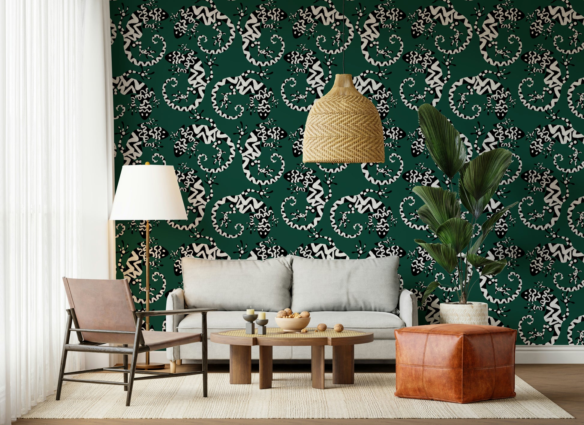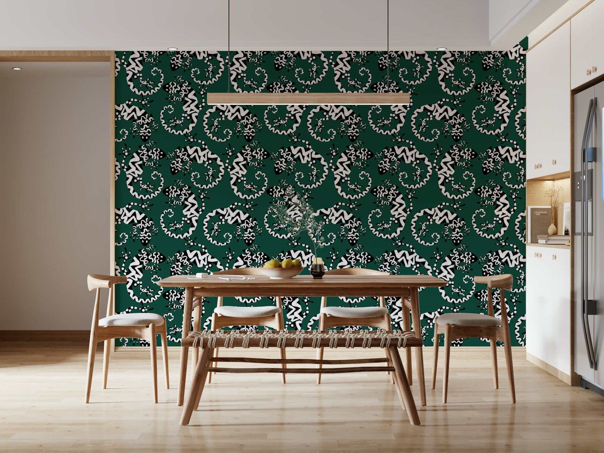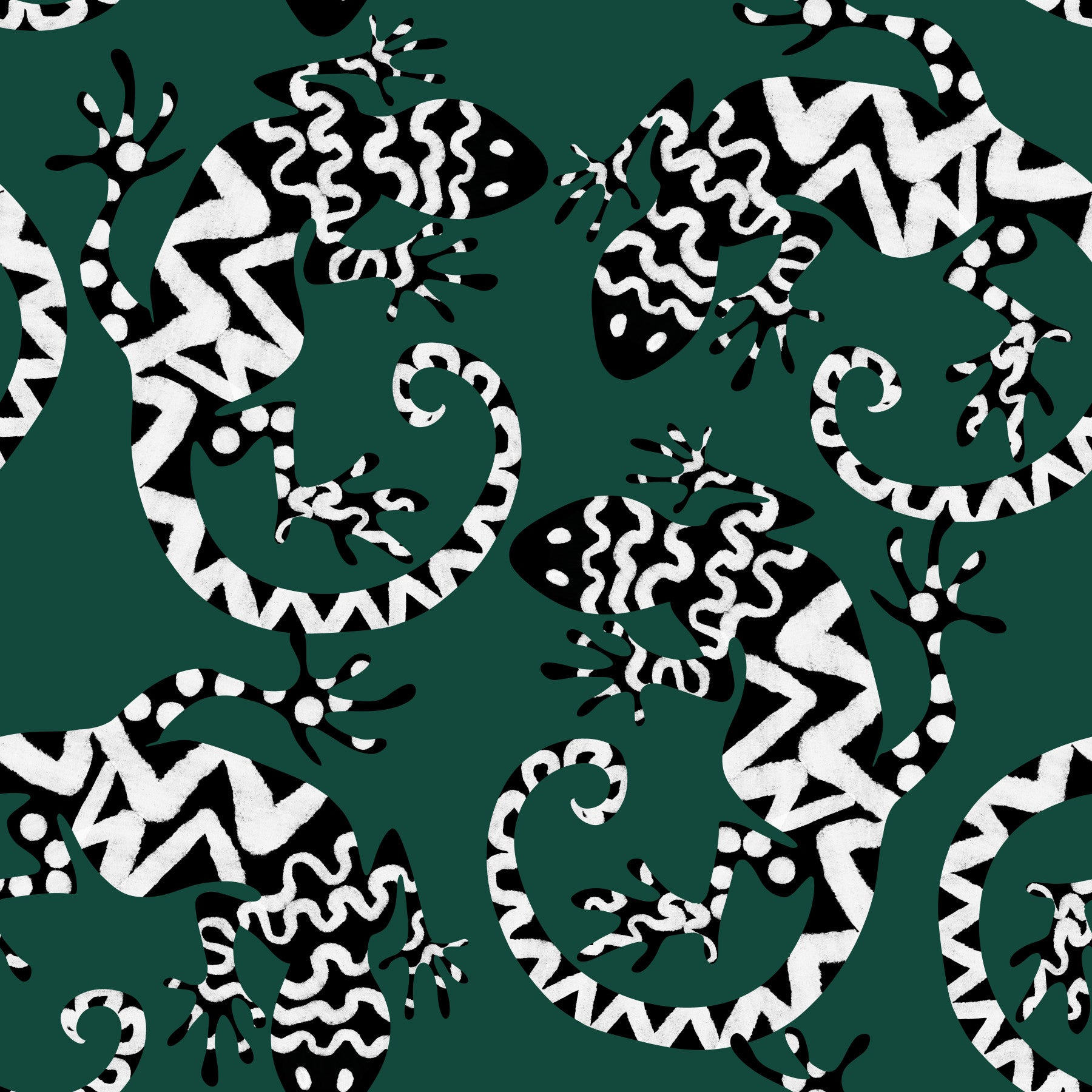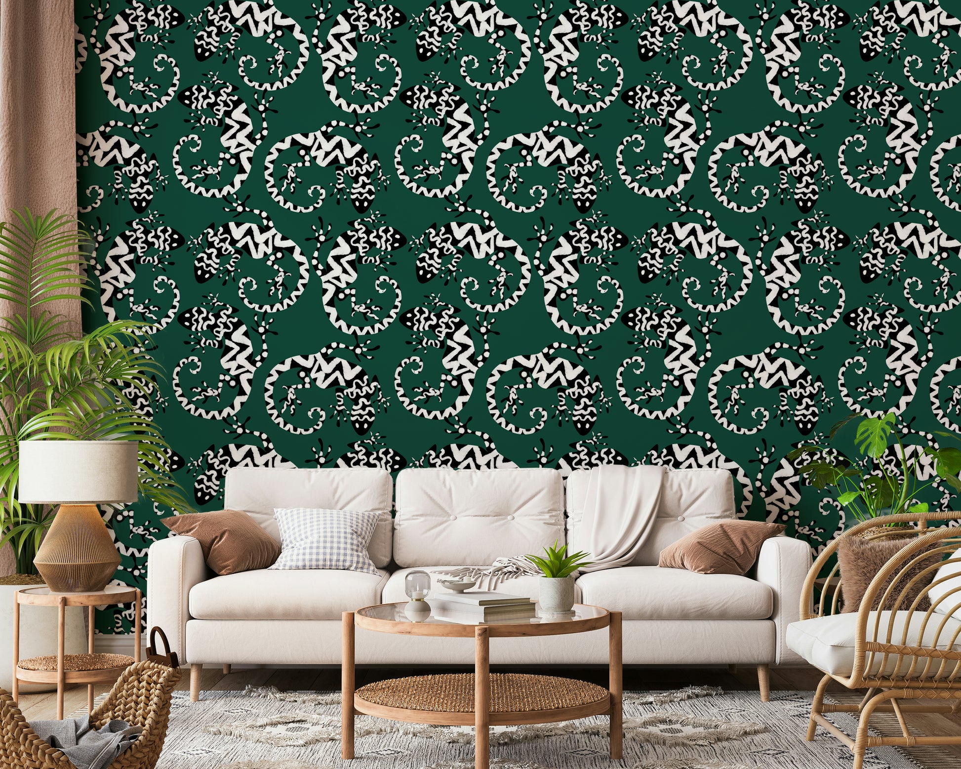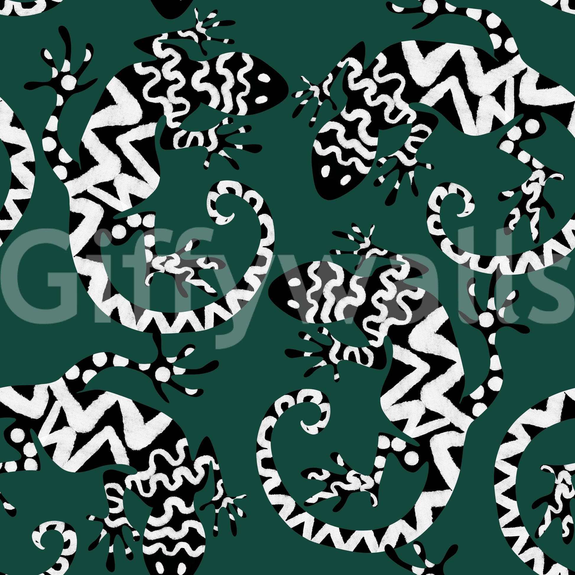 Trasforma qualsiasi stanza con questa straordinaria carta da parati ispirata ai gechi. Il motivo grafico in bianco e nero su uno sfondo verde intenso conferisce un tocco di esotismo. Le lucertole stilizzate creano un motivo vivace e ripetuto, moderno e senza tempo. Ideale per aggiungere personalità a soggiorni, corridoi o persino bagni, questo design è particolarmente indicato per gli spazi che cercano un tocco di fantasia. Aggiunge interesse visivo senza appesantire lo spazio, integrandosi sia con gli stili d'interni minimalisti che con quelli massimalisti. Il contrasto audace del motivo esalta il senso di profondità, rendendo gli ambienti più piccoli più ampi.