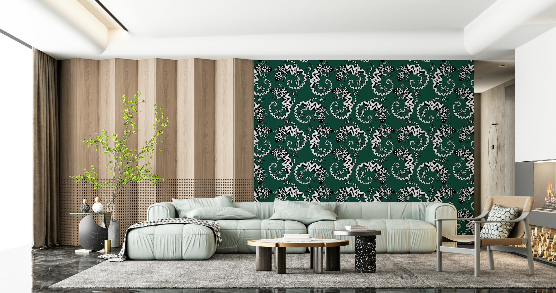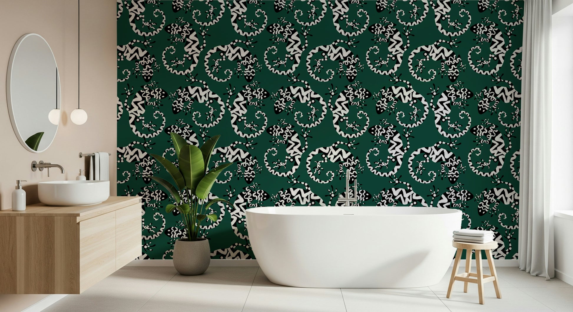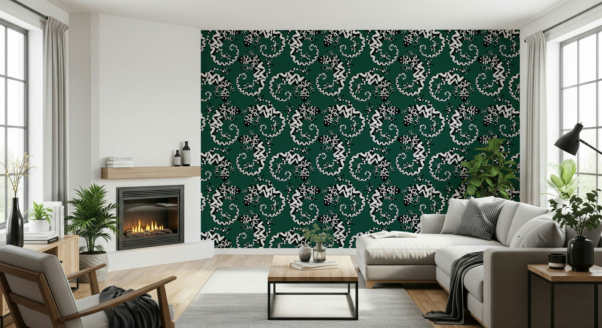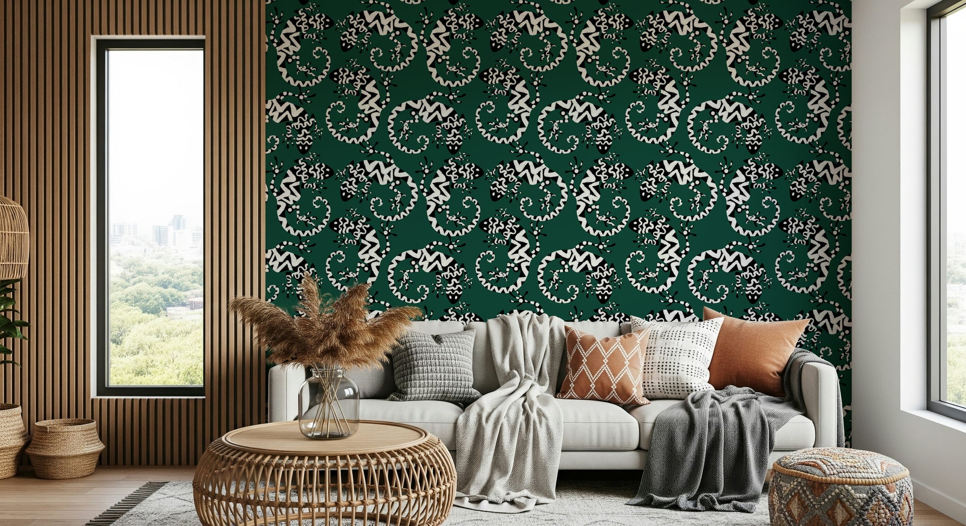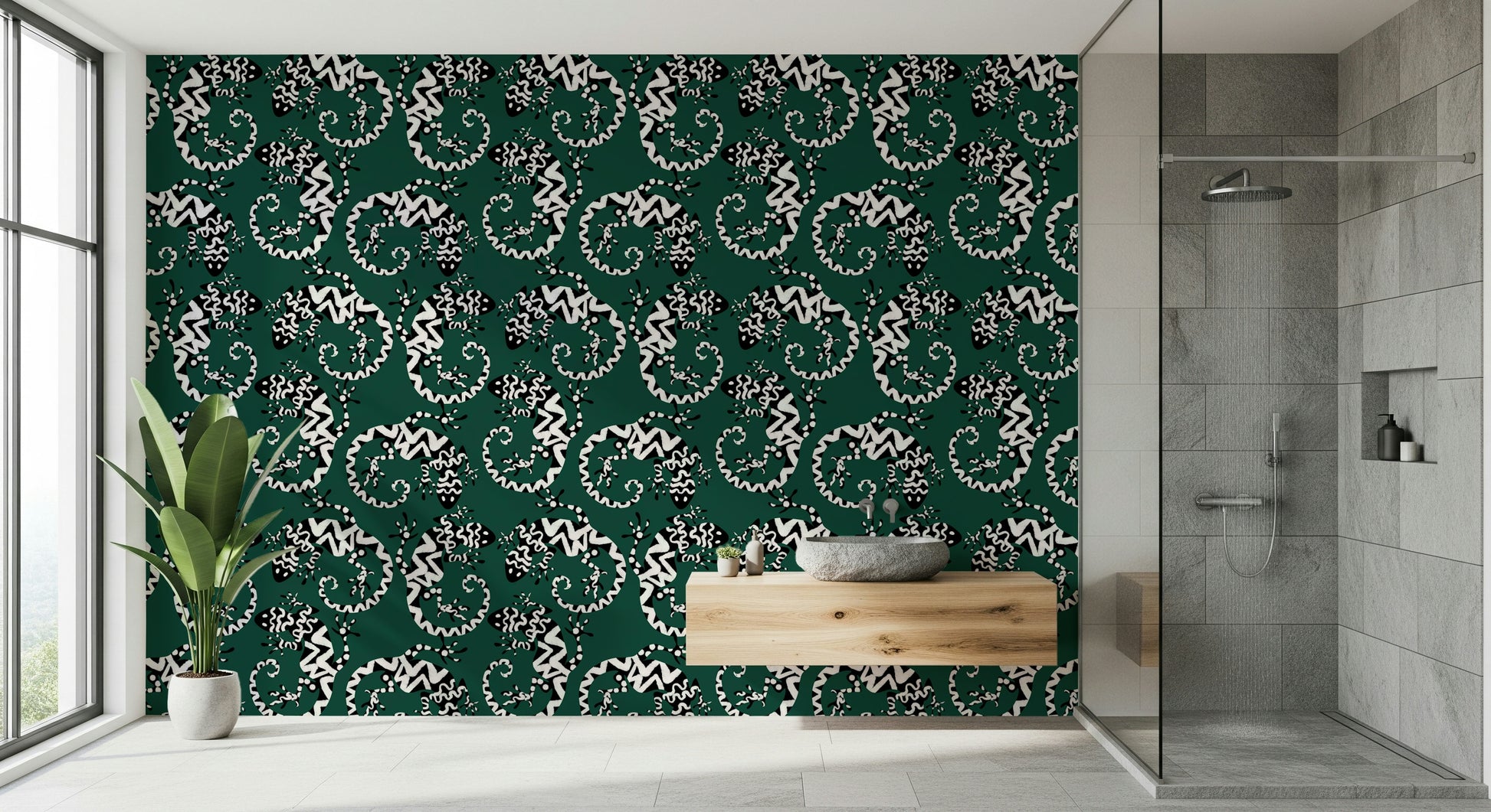 Trasforma qualsiasi stanza con questa straordinaria carta da parati ispirata ai gechi. Il motivo grafico in bianco e nero su uno sfondo verde intenso conferisce un tocco di esotismo. Le lucertole stilizzate creano un motivo vivace e ripetuto, moderno e senza tempo. Ideale per aggiungere personalità a soggiorni, corridoi o persino bagni, questo design è particolarmente indicato per gli spazi che cercano un tocco di fantasia. Aggiunge interesse visivo senza appesantire lo spazio, integrandosi sia con gli stili d'interni minimalisti che con quelli massimalisti. Il contrasto audace del motivo esalta il senso di profondità, rendendo gli ambienti più piccoli più ampi.
