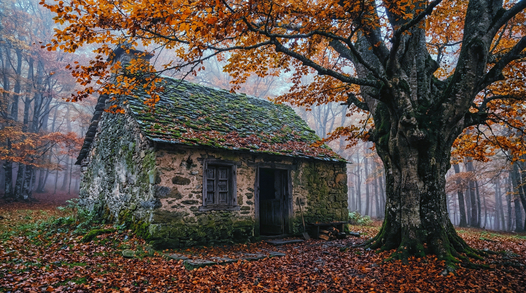 Harvest Hearth Haven wall mural with mossy roof, orange leaves, and forest mist
