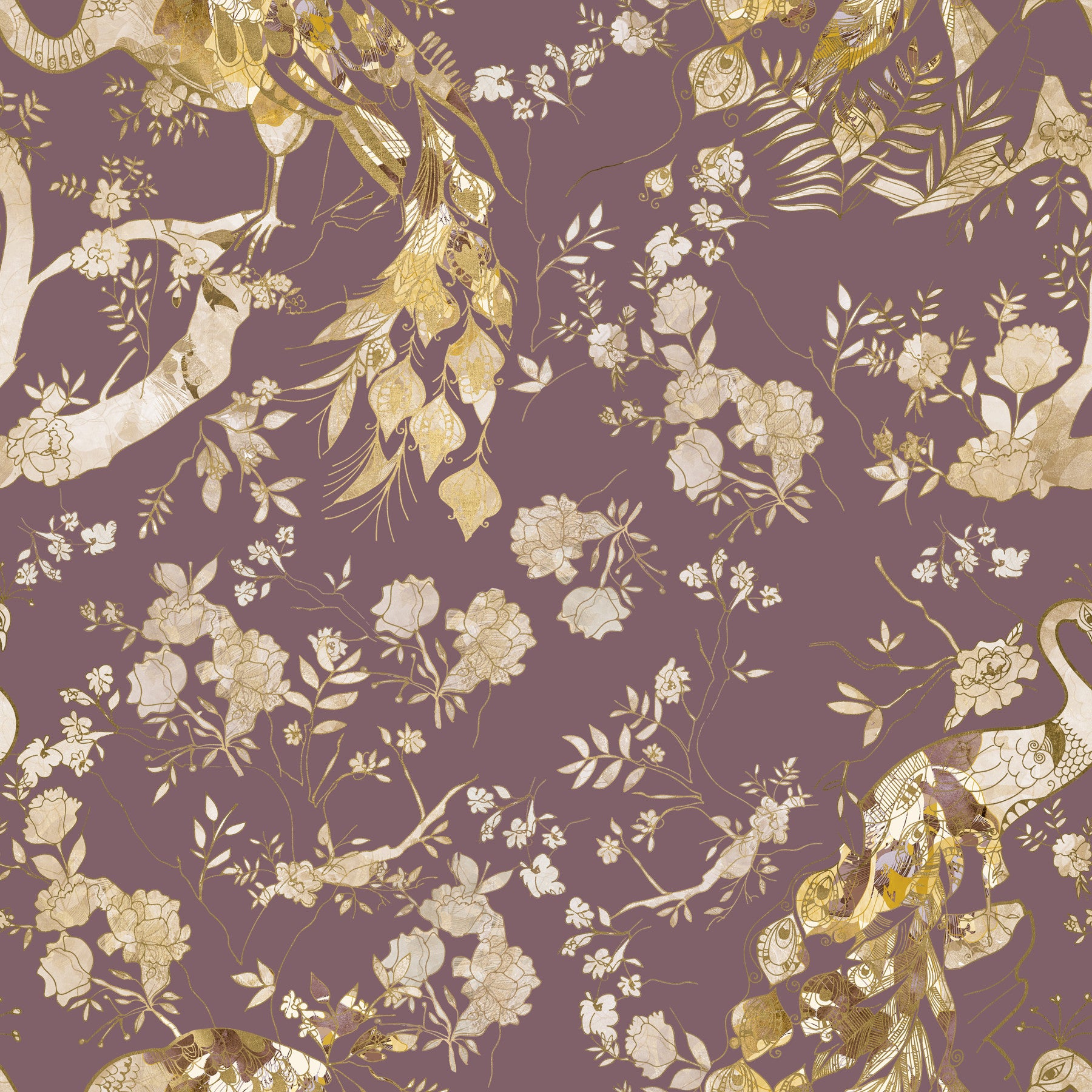 Carta da parati Heritage Plum con uccelli e fiori