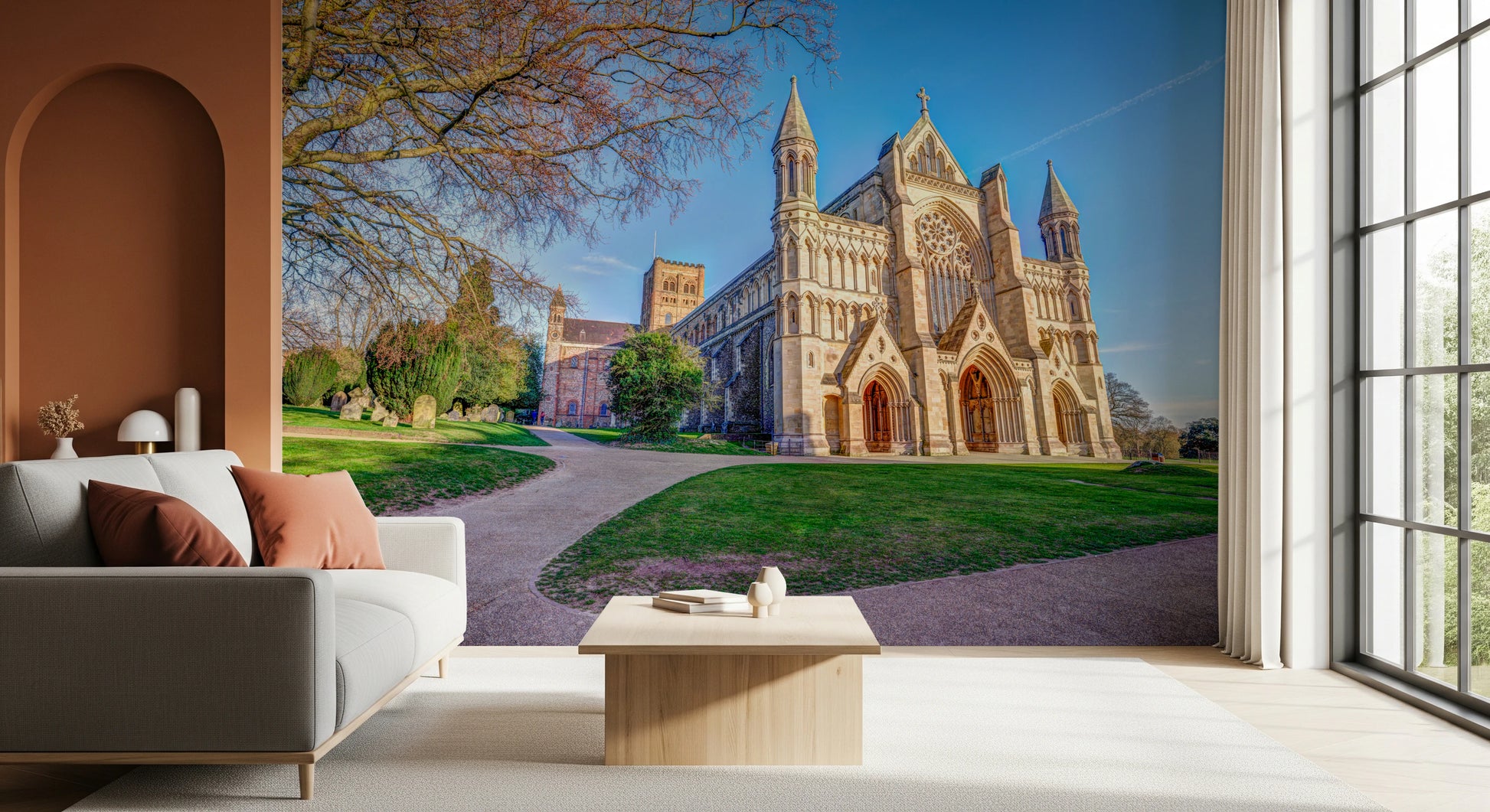 Trasforma il tuo spazio abitativo con la grandiosità della Cattedrale di St Albans. Questa decorazione murale architettonica mette in mostra l'iconico monumento immerso nella morbida luce del sole sotto un cielo azzurro terso. I dettagli intricati della facciata della cattedrale, dagli ingressi ad arco al maestoso rosone, sono resi con straordinaria chiarezza, offrendo un senso di bellezza senza tempo e di riflessione spirituale. Un albero tentacolare con delicati rami in boccio aggiunge un tocco di grazia naturale, incorniciando l'edificio storico. I prati verdeggianti e i sentieri tortuosi creano un senso di pace e tranquillità. Valorizza qualsiasi stanza con questo pezzo sofisticato, perfetto per aggiungere un tocco di fascino antico ed eleganza architettonica.