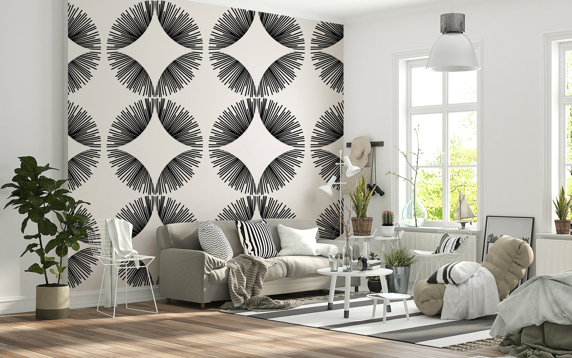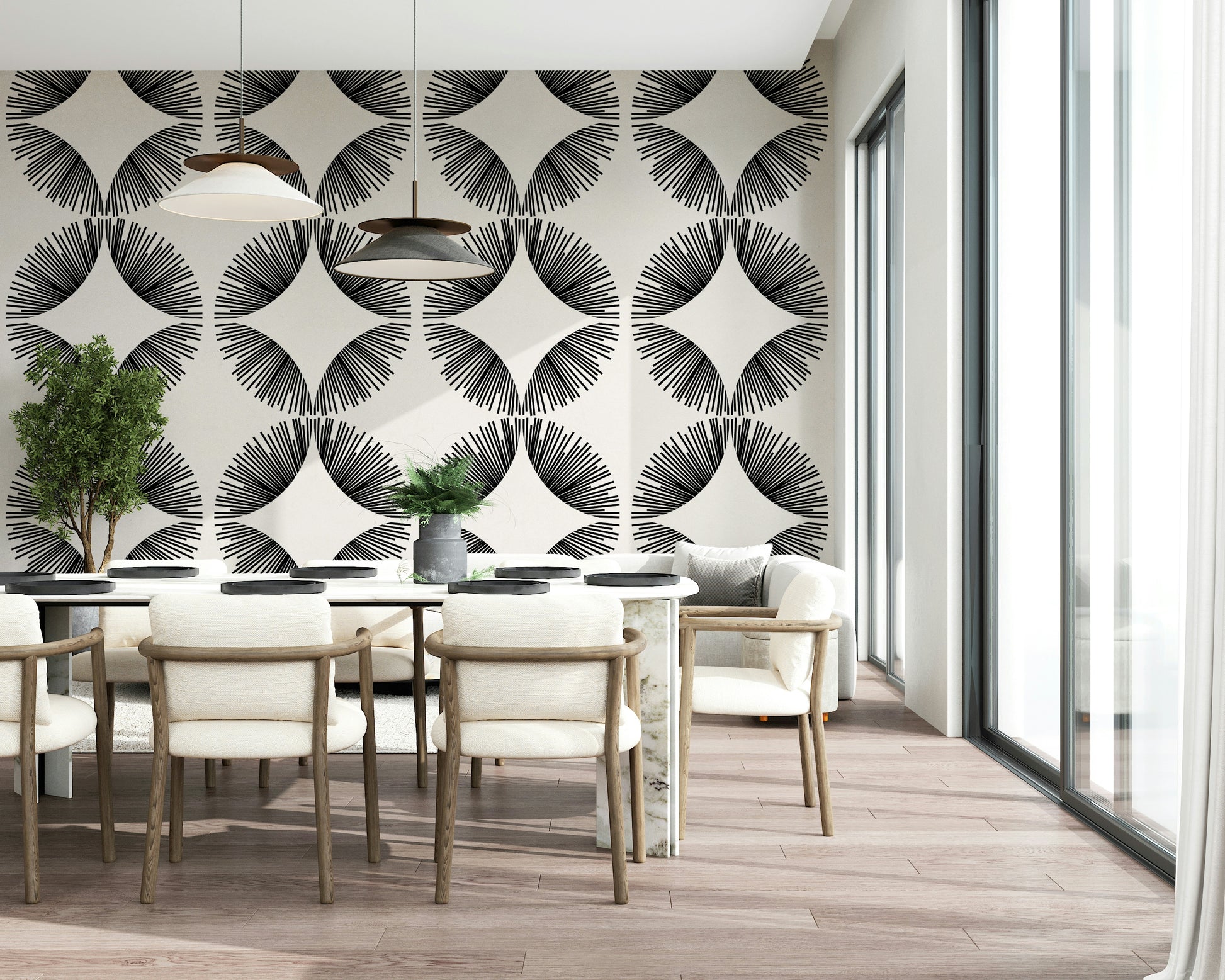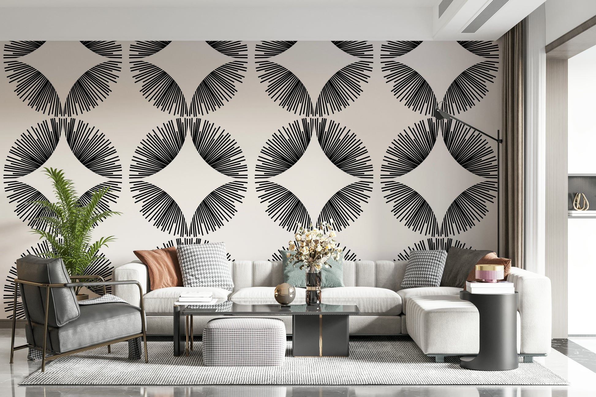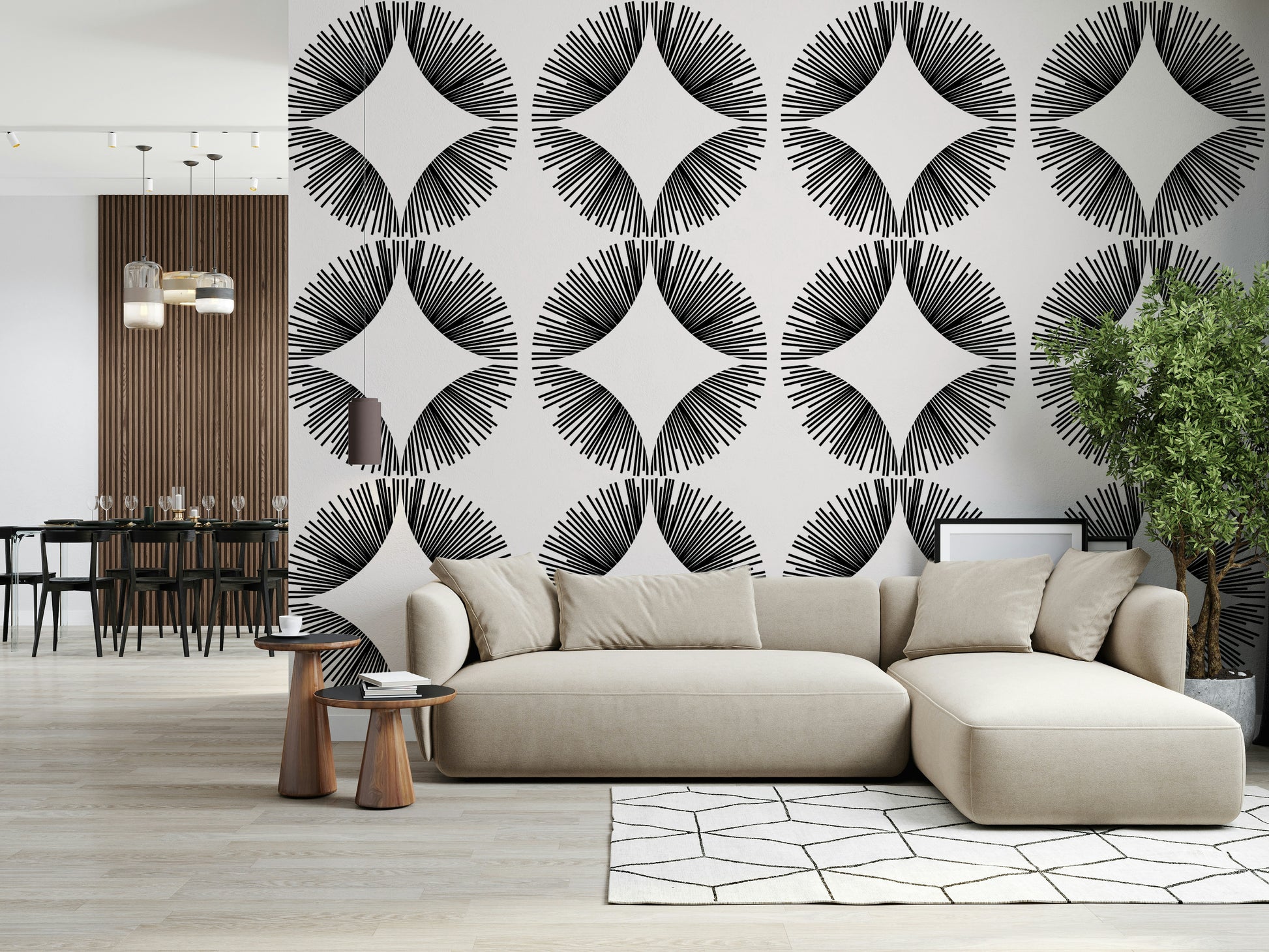 Immergi la tua casa nell'elegante semplicità di questa carta da parati ispirata alle stelle. Linee geometriche nere risaltano su uno sfondo chiaro. Il design evoca un senso di energia irradiante. La palette monocromatica offre uno sfondo versatile, rendendola un'ottima aggiunta a diversi stili d'interni. Installala in soggiorno per un tocco di sobrietà, o in camera da letto per un'atmosfera moderna. Questo motivo risplende in uffici o ingressi, soprattutto in spazi che richiedono un'estetica pulita. Introduci questo look classico ma moderno per impreziosire gli spazi con linee pulite e un impatto visivo audace.