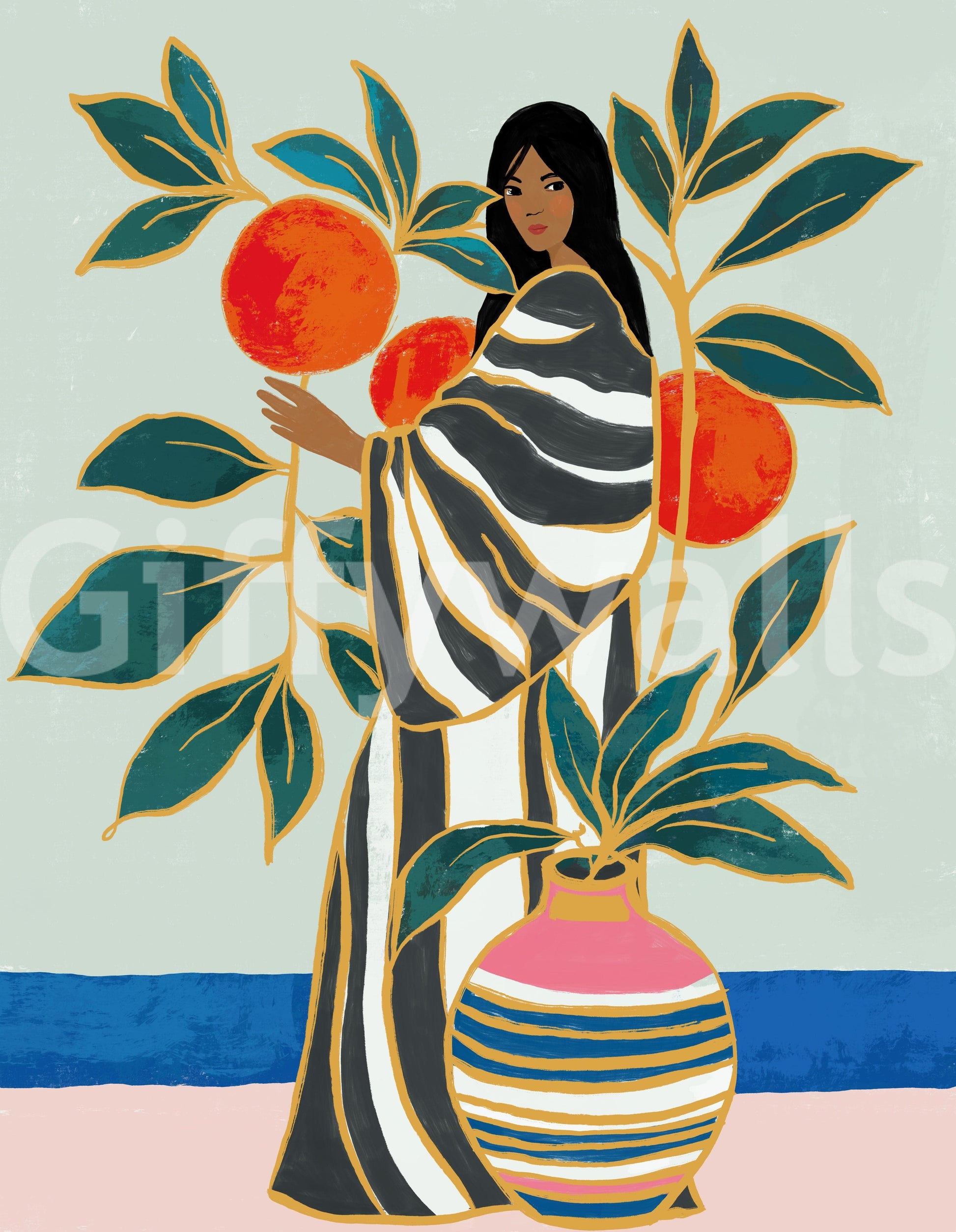 Invita un tocco di serena eleganza nel tuo spazio con "The Keeper of Oranges". Questa accattivante opera raffigura una figura aggraziata, adornata da un sorprendente abito a righe, che si prende cura delicatamente di un vivace albero di arance. I tratti decisi e le tonalità calde creano un senso di tranquillità, mentre i motivi grafici aggiungono un tocco moderno. Un elegante vaso completa la composizione, aggiungendo un tocco finale a questa scena di sobria bellezza. Immagina come questa immagine darà un'impressione invitante e confortevole. Ideale per aggiungere un tocco sofisticato e colorato a qualsiasi stanza, "The Keeper of Oranges" è più di una semplice opera d'arte: è una dichiarazione d'intenti. L'opera perfetta per trasformare la tua parete in una galleria. Porta la bellezza e la generosità della natura in casa con questa splendida celebrazione visiva, trasformando la tua casa in un rifugio accogliente.