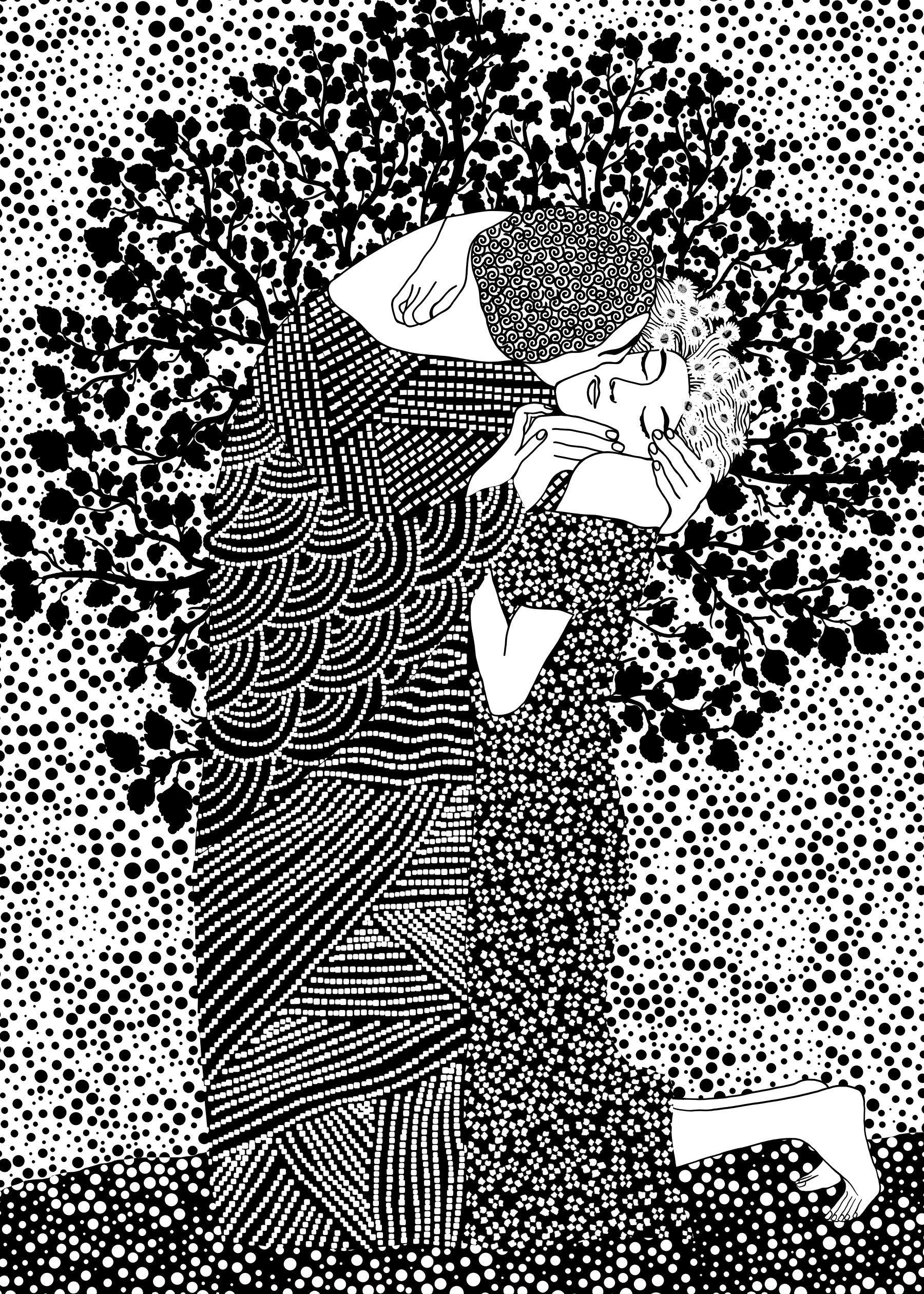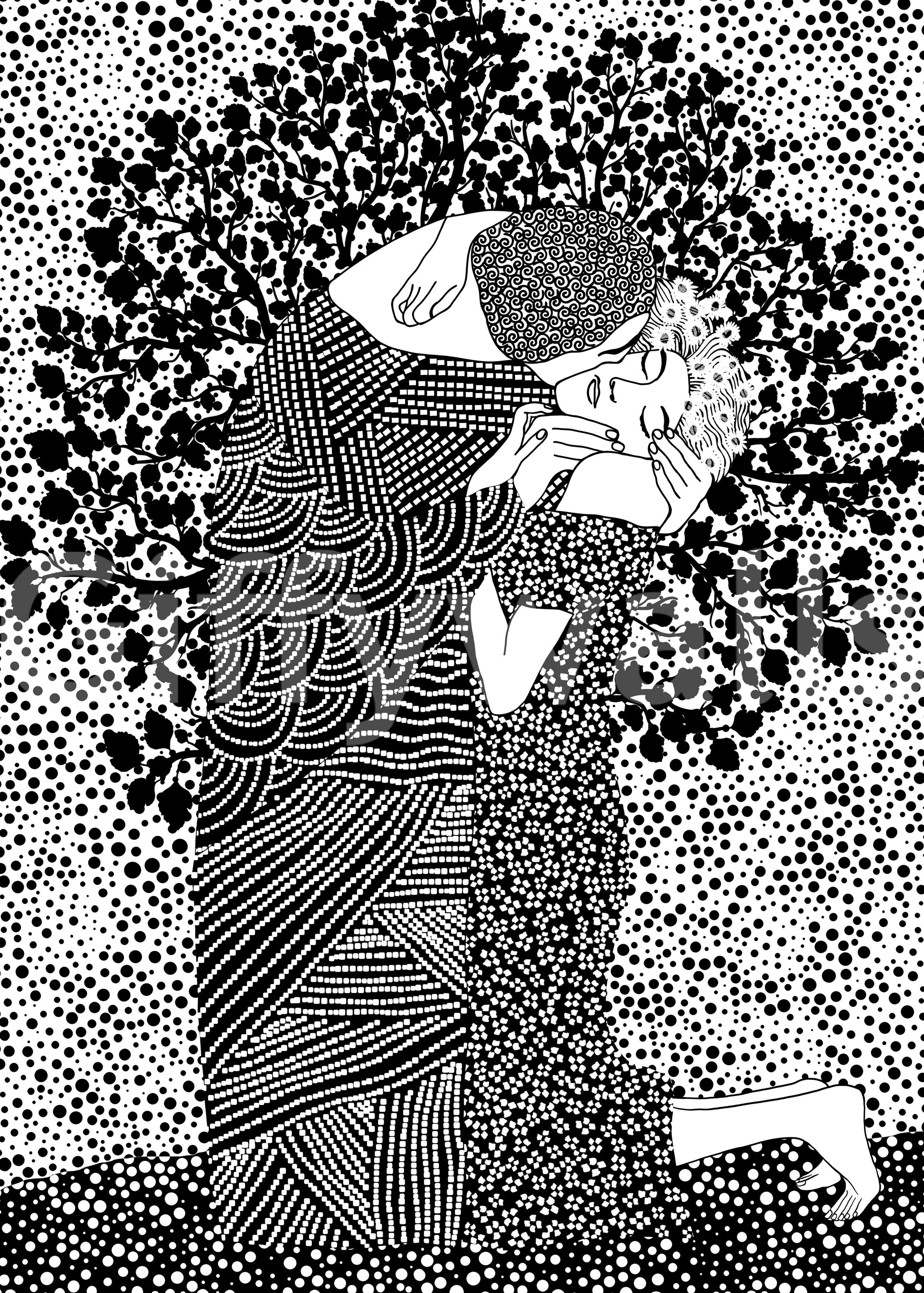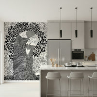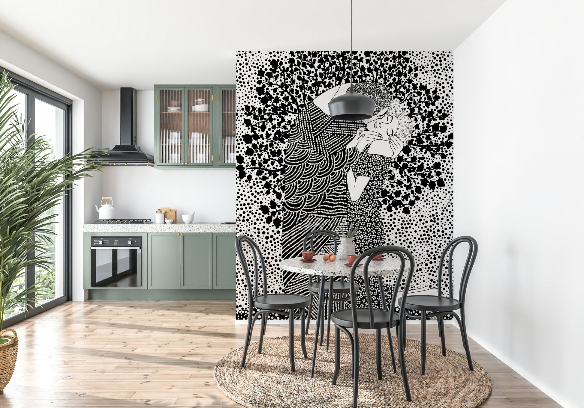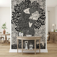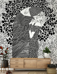 Abbraccia il potere dell'affetto con "The Kiss II", un sorprendente design monocromatico che dona un tocco artistico al tuo spazio abitativo. Questa intima decorazione murale raffigura una coppia stretta in un tenero abbraccio, resa con dettagli squisiti. Un baldacchino di foglie stilizzate e uno sfondo vorticoso creano un'atmosfera onirica, evocando sensazioni di serenità e passione. La palette di bianco e nero conferisce un'estetica senza tempo e sofisticata, adatta a diversi stili d'interni. Nota gli intricati motivi che adornano i loro abiti, aggiungendo un tocco di texture e interesse visivo all'opera. Trasforma qualsiasi stanza in un'oasi di amore e tranquillità con questa accattivante opera d'arte, infondendo alle tue pareti un innegabile senso di romanticismo e un tocco moderno. È più di una semplice decorazione; è una dichiarazione sulla bellezza e la profondità del legame umano, catturata per sempre in uno straordinario capolavoro visivo.