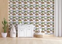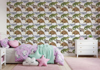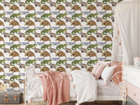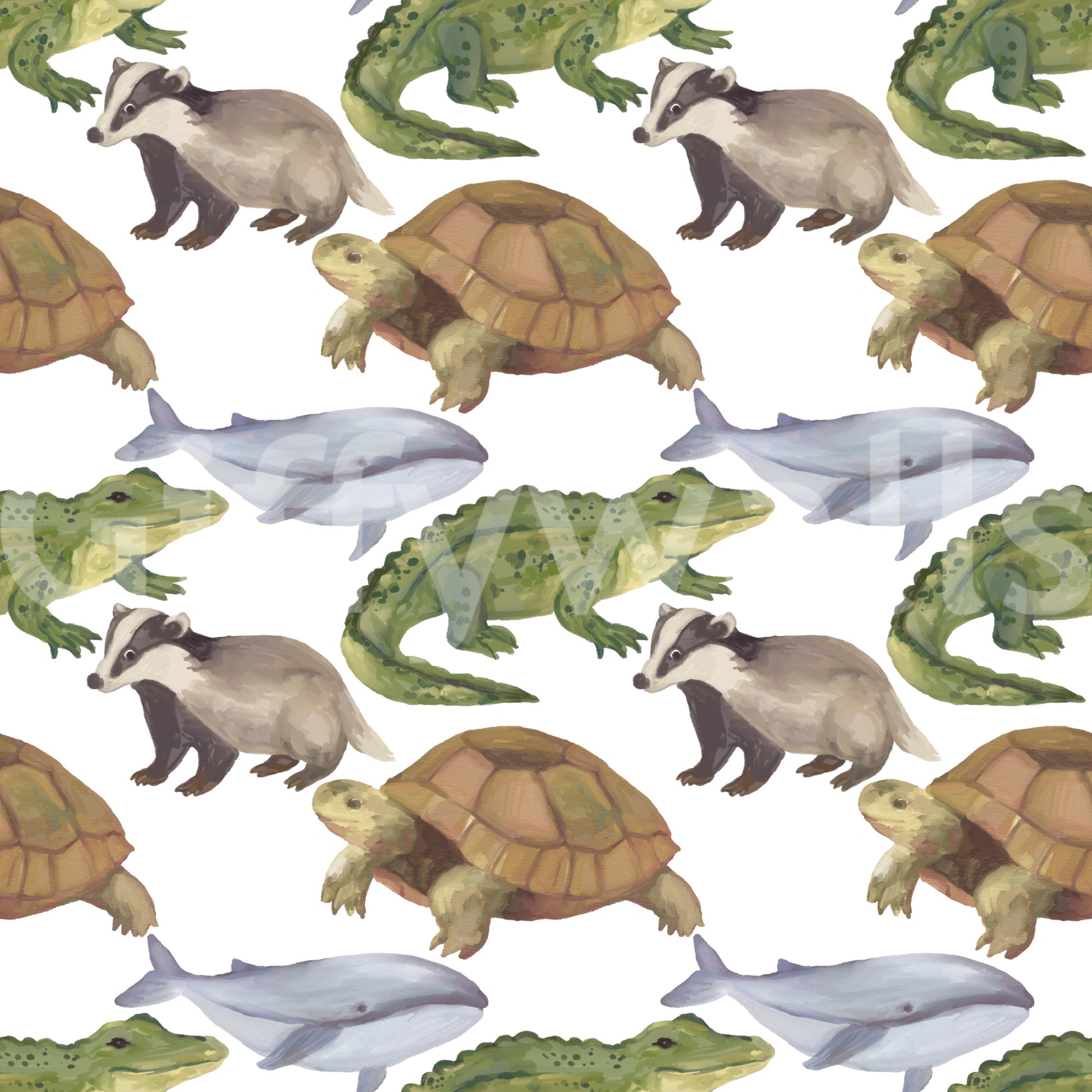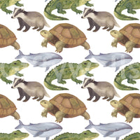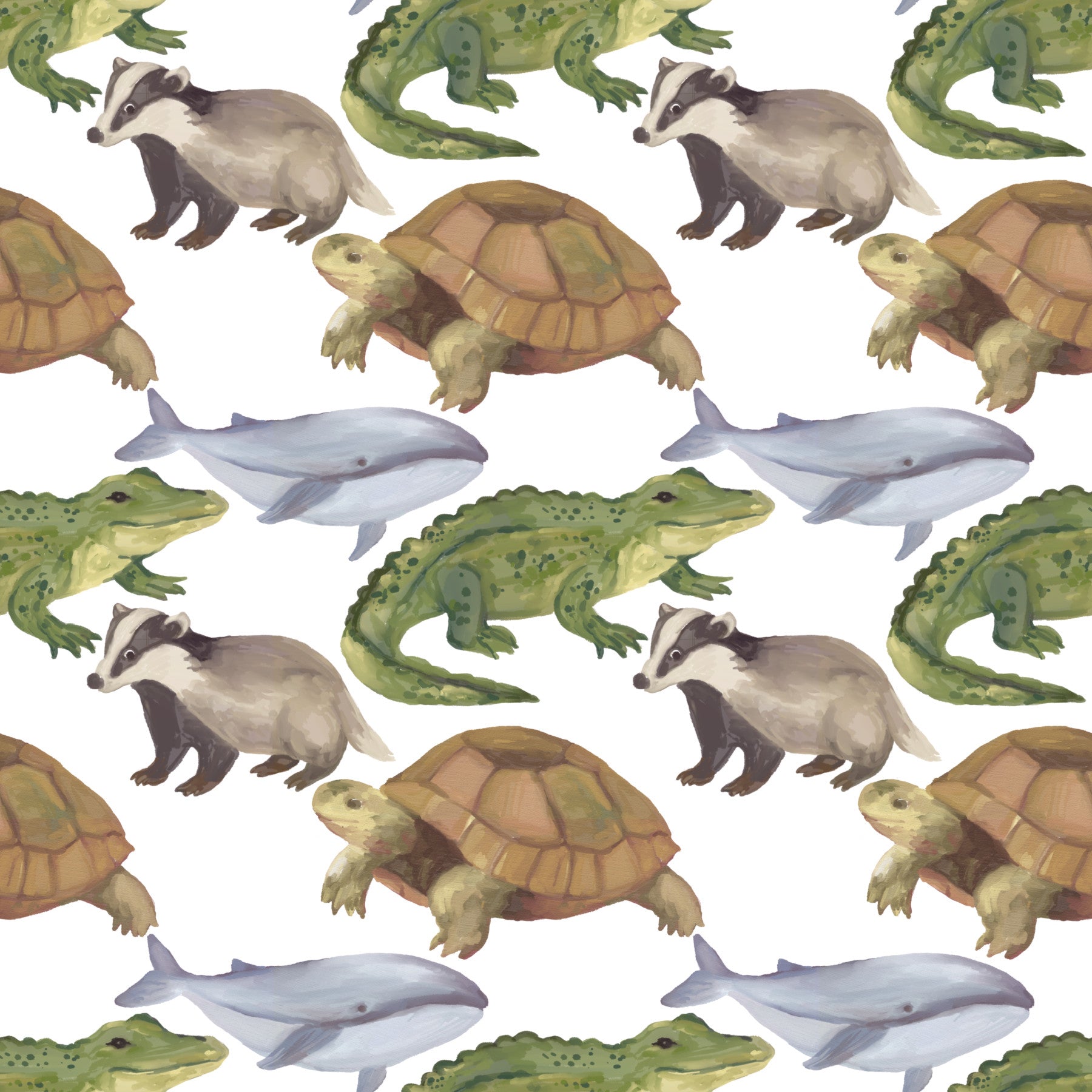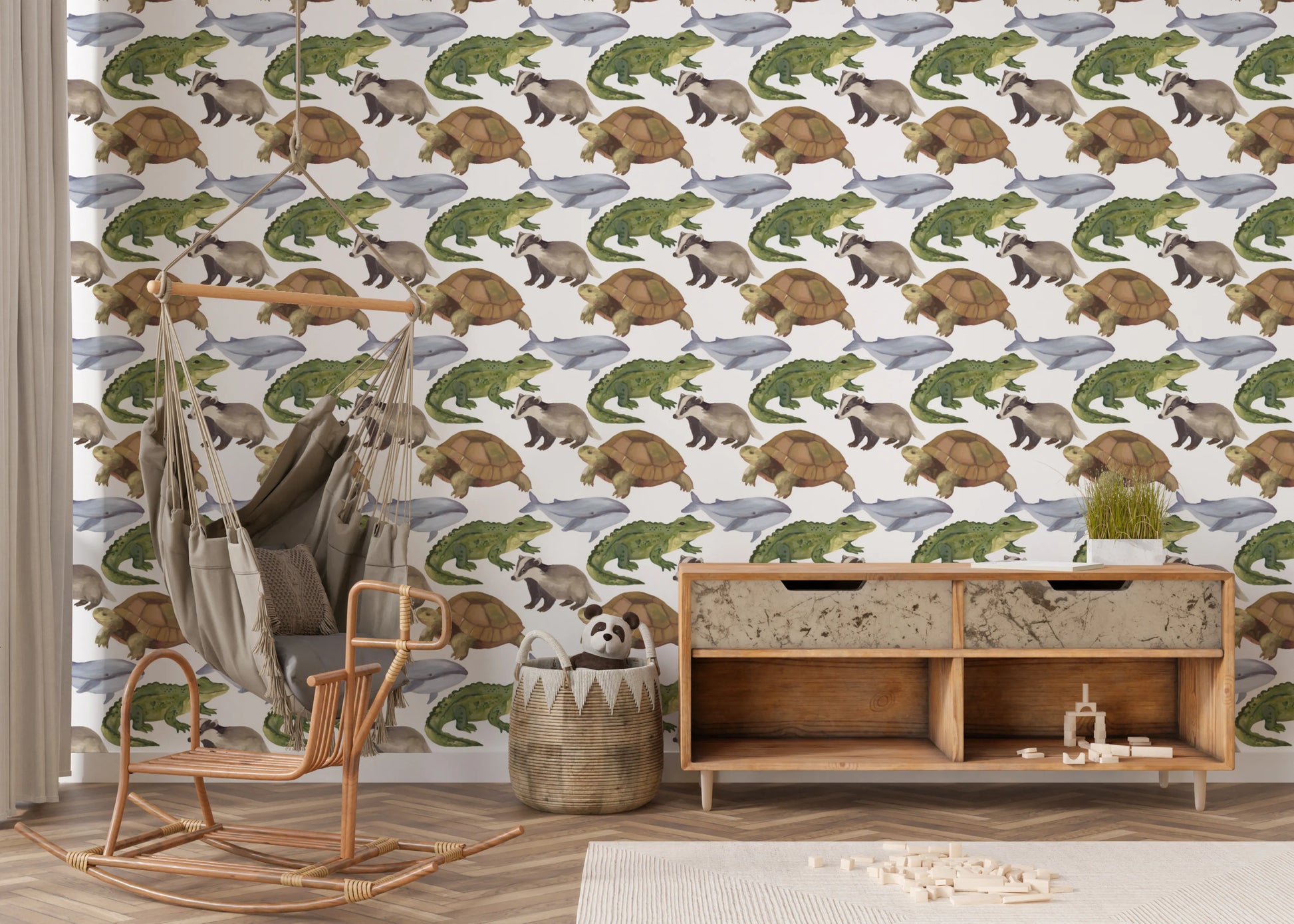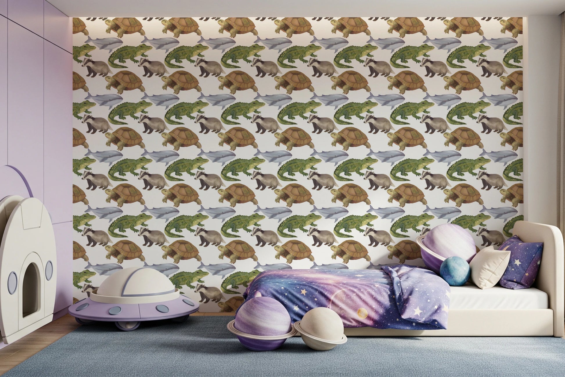 Carta da parati per cameretta dei bambini con tema animali acquerello, tartaruga, coccodrillo e balena
