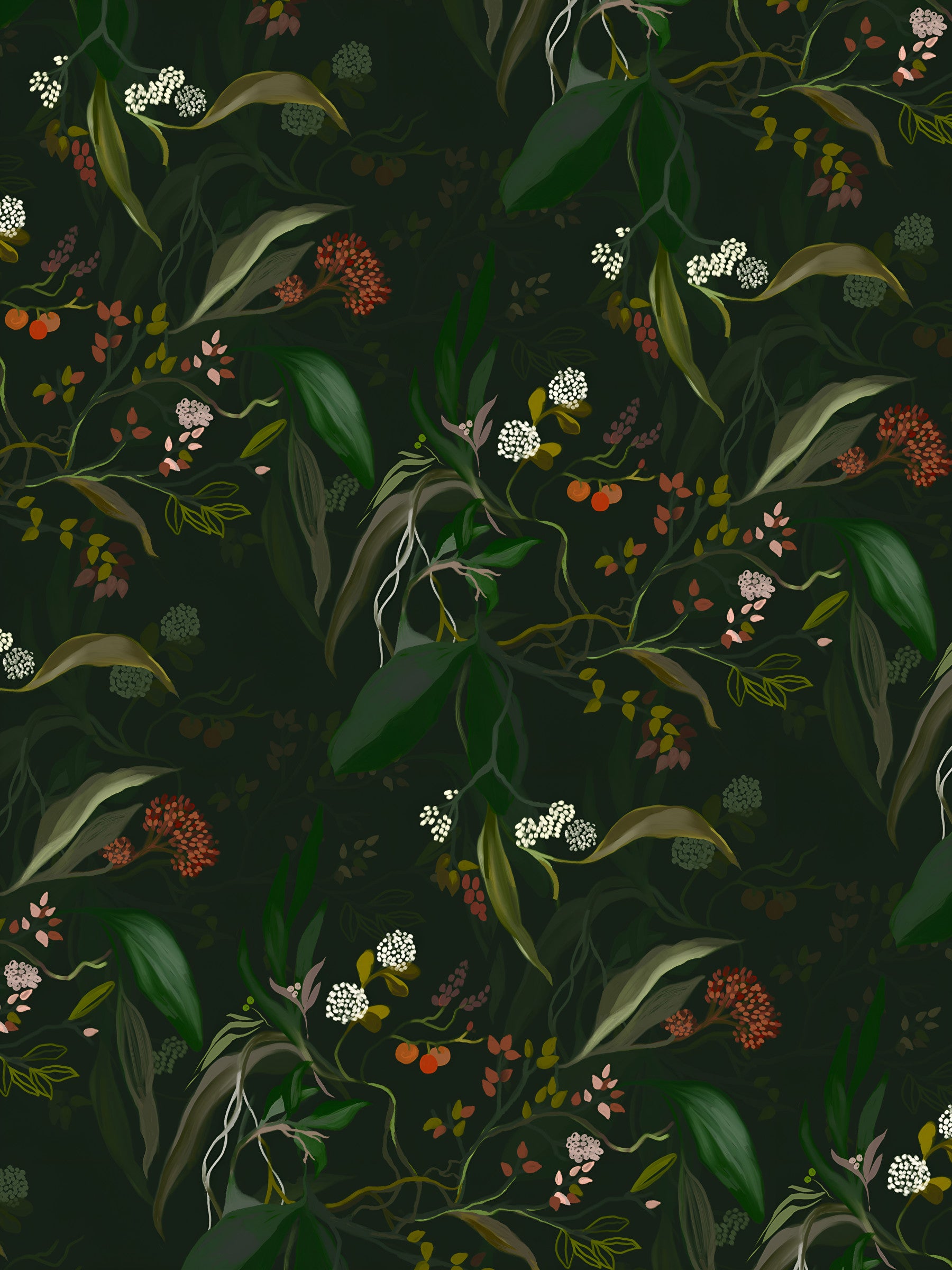 Transform your home with this dark floral wallpaper for walls, showcasing a rich, botanical design against a deep green backdrop. This pattern displays leaves, berries, and small flowers, providing a peaceful yet luxurious aesthetic. The botanical pattern creates an inviting feel in living rooms, bedrooms, or hallways. Introduce a sense of calm and sophisticated drama to your interior decor. Enhance rooms with nature's beauty.