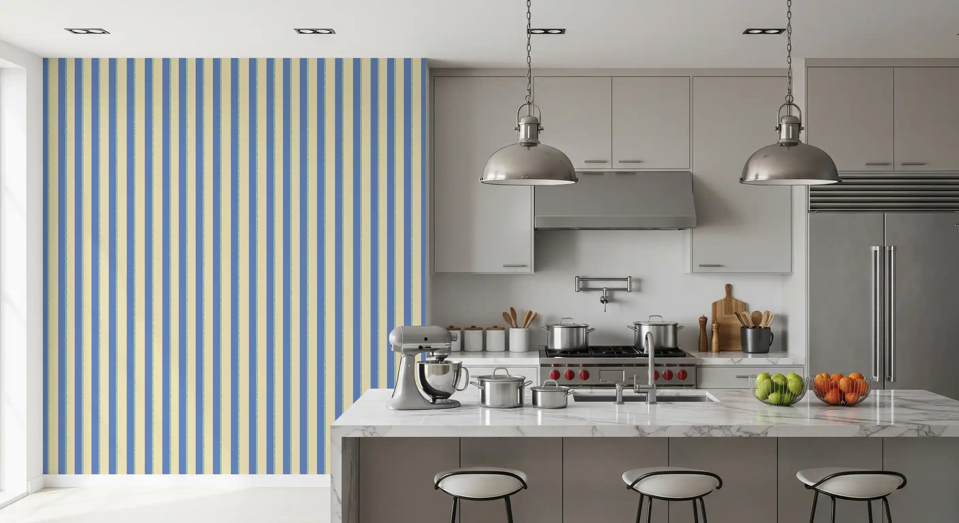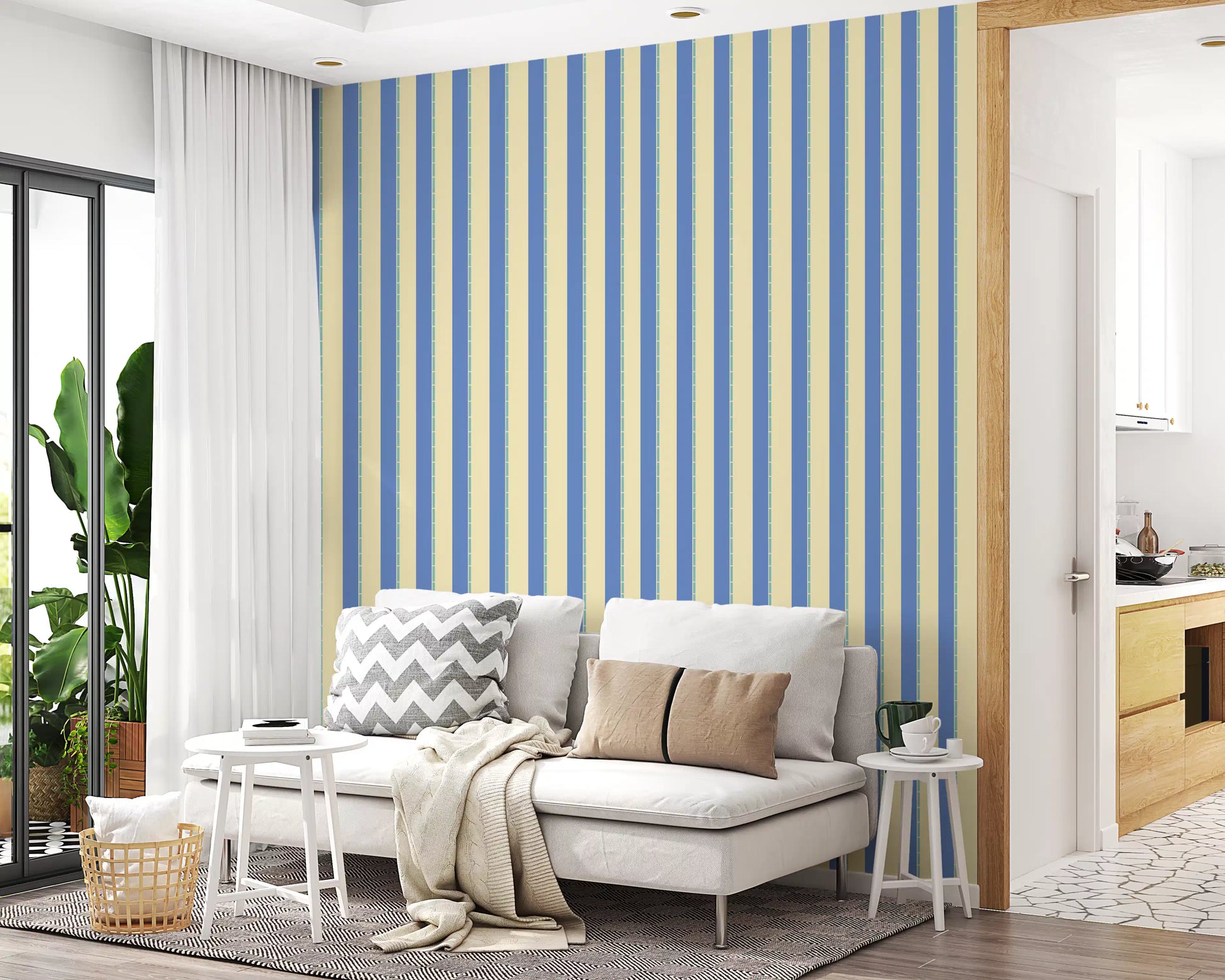 Trasforma il tuo spazio con la carta da parati Coastal Stripes per pareti. Questo design presenta un classico motivo a righe, con ampie fasce di un blu rilassante alternate a un beige neutro. Sottili linee verde acqua accentuano ogni striscia, aggiungendo un dettaglio discreto. La combinazione di colori evoca un senso di serenità marina, rendendola perfetta per camere da letto, bagni o qualsiasi stanza in cui si cerchi un'atmosfera tranquilla. Le strisce verticali allungano le pareti, aumentando il senso di spazio, mentre i toni morbidi e tenui conferiscono un'eleganza sobria a soggiorni, corridoi e uffici. Questo design versatile dona un tocco di fascino tradizionale alle case moderne.