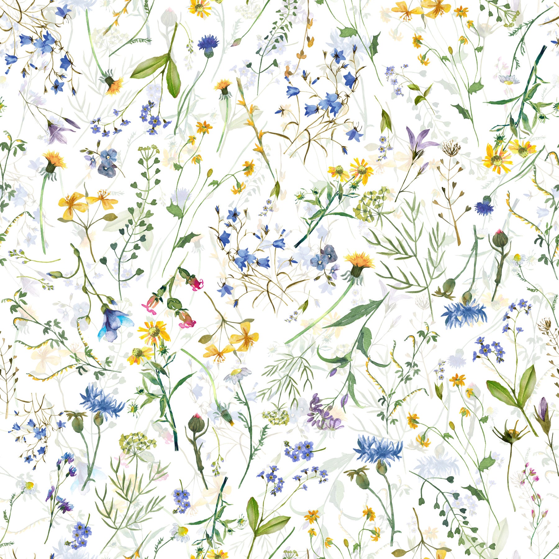 Bring the tranquility of a sun-drenched meadow into your home with this floral wallpaper by Uta Naumann. This design features a delicate watercolor style, showcasing a variety of wildflowers in soft blues, yellows, and greens. The seamless pattern creates a continuous field of blooms that feels fresh and inviting. Ideal for bedrooms, living rooms, or even a cozy kitchen, this wallpaper for walls introduces a touch of nature indoors. The light and airy feel complements any interior decor, creating a space that feels both serene and stylish.