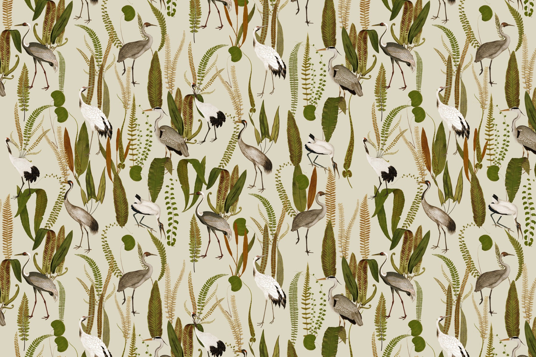 Create a sophisticated natural space with this elegant crane garden design by Uta Naumann. This wallpaper features beautiful crane illustrations among sprawling foliage. The subdued beige background emphasizes the detailed greenery and brown hues, bringing the serenity of nature indoors. This wallpaper for walls works great in a living room, bedroom, or dining room, complementing modern and classic styles. Transform your home into a tranquil retreat with this graceful and inviting design.