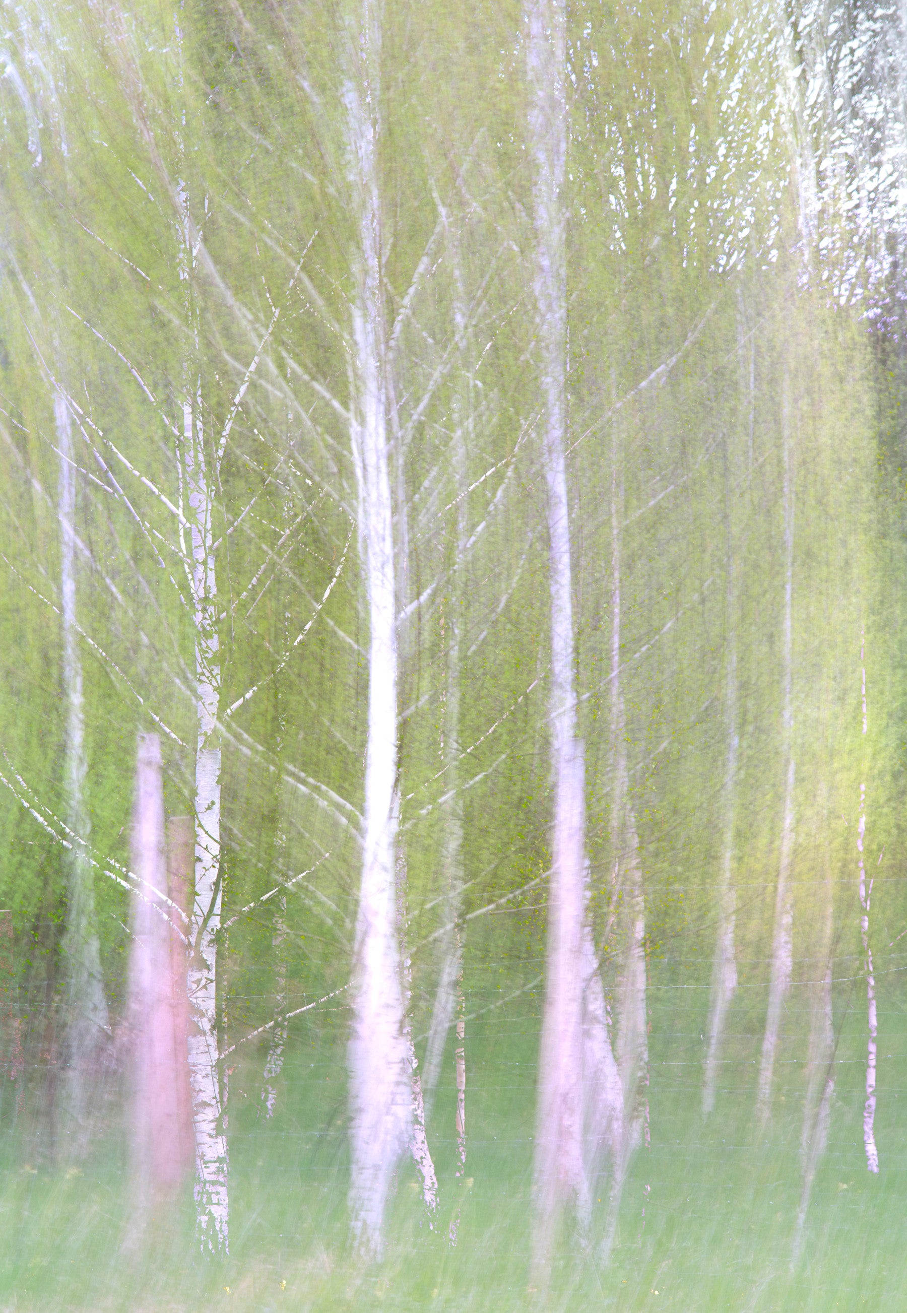 Tall, slender birch tree trunks with white and grey bark are the main subject.