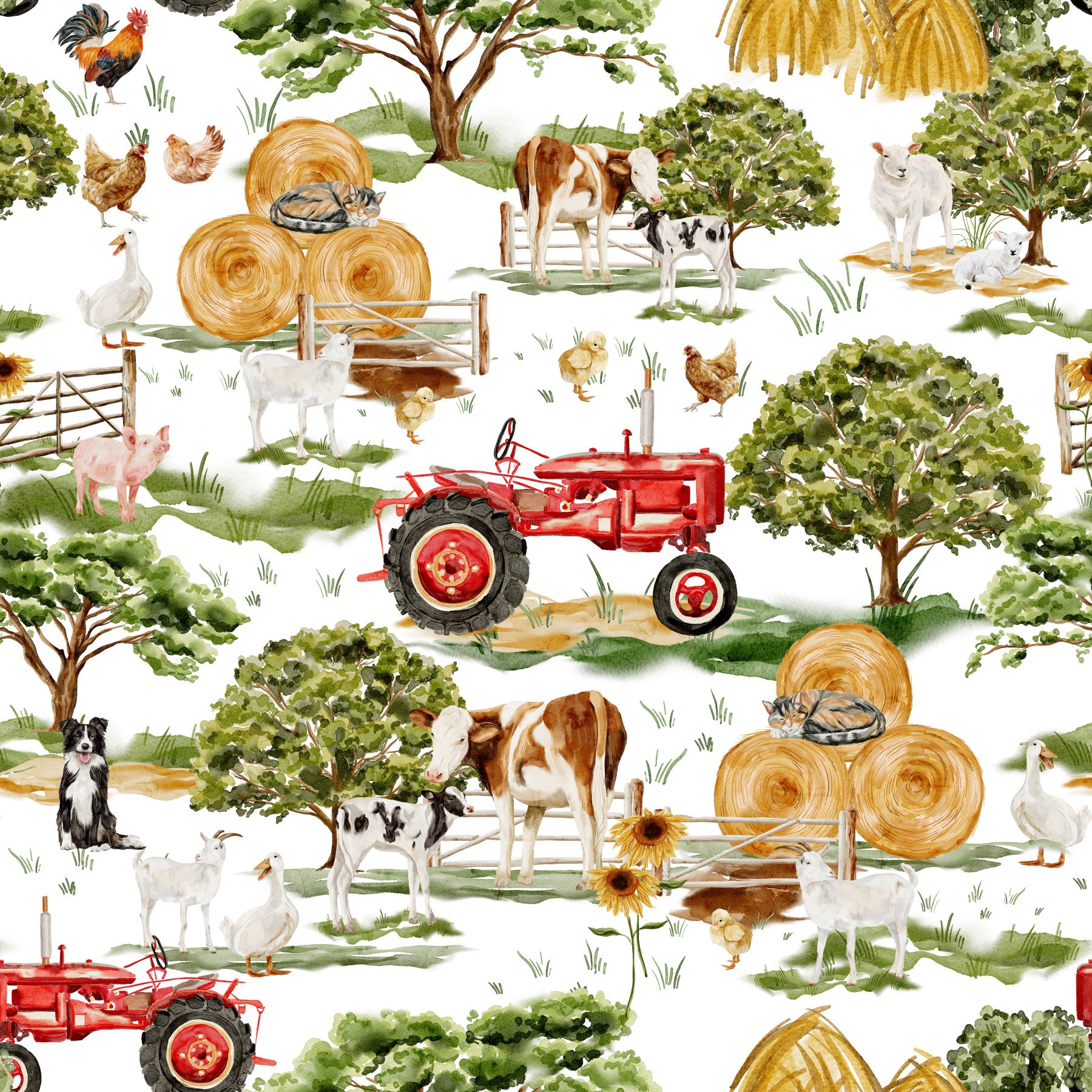 Escape to a charming countryside retreat with our Farm Animals design. This vibrant pattern captures the joyful spirit of the farm, showcasing watercolor cows, playful kittens, and a vintage red tractor nestled among hay bales and lush greenery. The artistic detail and refreshing colors create a lively feel, perfect for a nursery or kitchen. Available as a premium wallpaper mural or convenient peel and stick wallpaper, it makes decorating simple and fun. Instantly brighten your space with this captivating scene! Discover your favorite farm creature today.