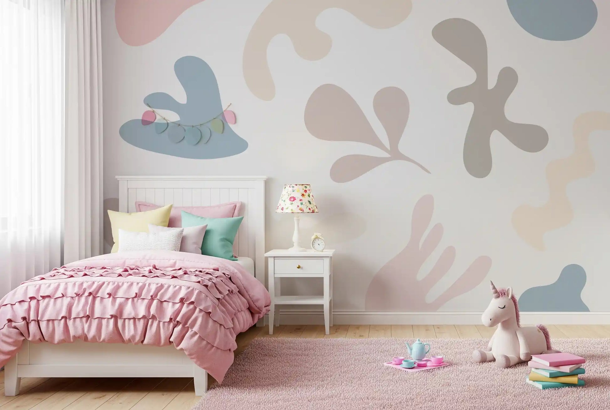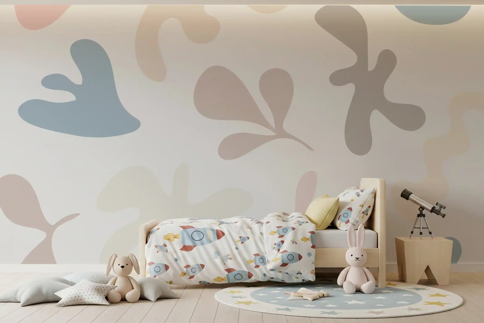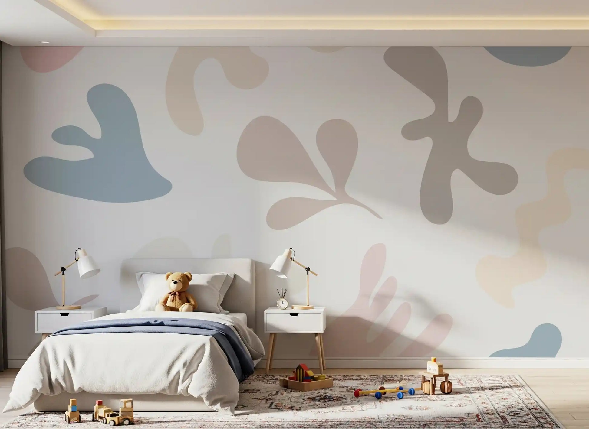 Questa affascinante carta da parati per pareti presenta un motivo coinvolgente di forme morbide e organiche che evocano una sensazione di calma e giocosità. Il suo design astratto, che ricorda ritagli artistici, dona un’estetica contemporanea ma senza tempo a qualsiasi ambiente. La delicata palette di colori include rosa smorzati, blu rilassanti, beige caldi e taupe sottili, il tutto su uno sfondo pulito color avorio. Questa combinazione armoniosa crea un’atmosfera serena e accogliente. Ideale per camerette, stanze per bambini o anche un soggiorno o una camera da letto tranquilli, questo design introduce un interesse visivo delicato senza sovraccaricare i sensi. Si abbina splendidamente a stili d’interni moderni e minimalisti, trasformando le pareti in una tela di espressione artistica e pacifica.