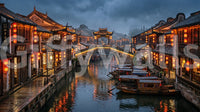 Immergi il tuo spazio nella tranquilla bellezza di un antico villaggio d'acqua dell’Asia orientale. Questa carta da parati affascinante cattura una pittoresca scena di un canale sotto un cielo cupo e nuvoloso, illuminato da calde lanterne arancioni. Edifici tradizionali in legno fiancheggiano il corso d’acqua, i loro dettagli intricati si riflettono con grazia sull’acqua calma dove barche classiche scivolano dolcemente. La ricca palette di colori, con profondi blu e grigi contrastati da rossi vivaci e gialli dorati, crea un’atmosfera accogliente e drammatica. Questo design porta un senso di storia culturale serena e di elegante quiete a soggiorni, sale da pranzo o studi. Trasforma qualsiasi parete in una finestra affascinante verso una destinazione senza tempo e suggestiva, aggiungendo profondità e un punto focale unico al tuo arredamento.