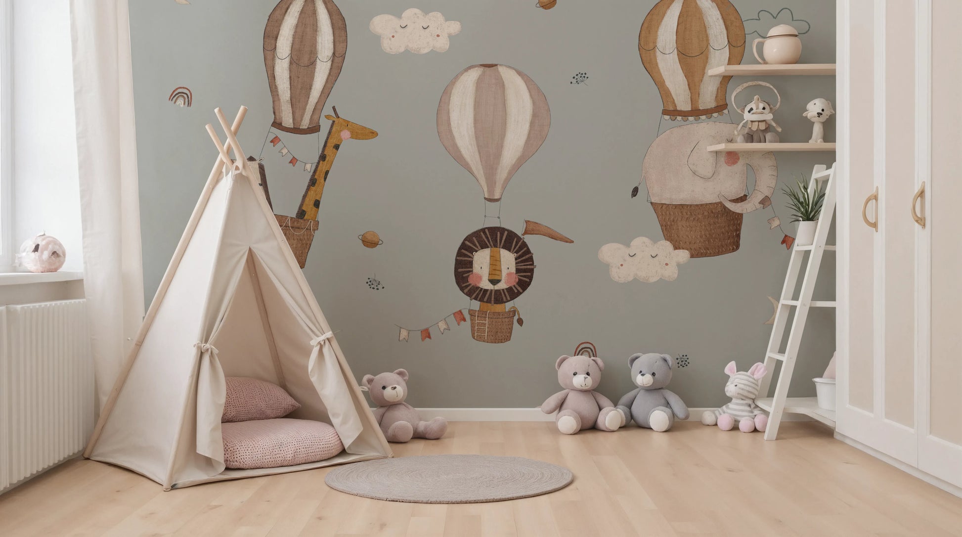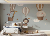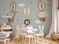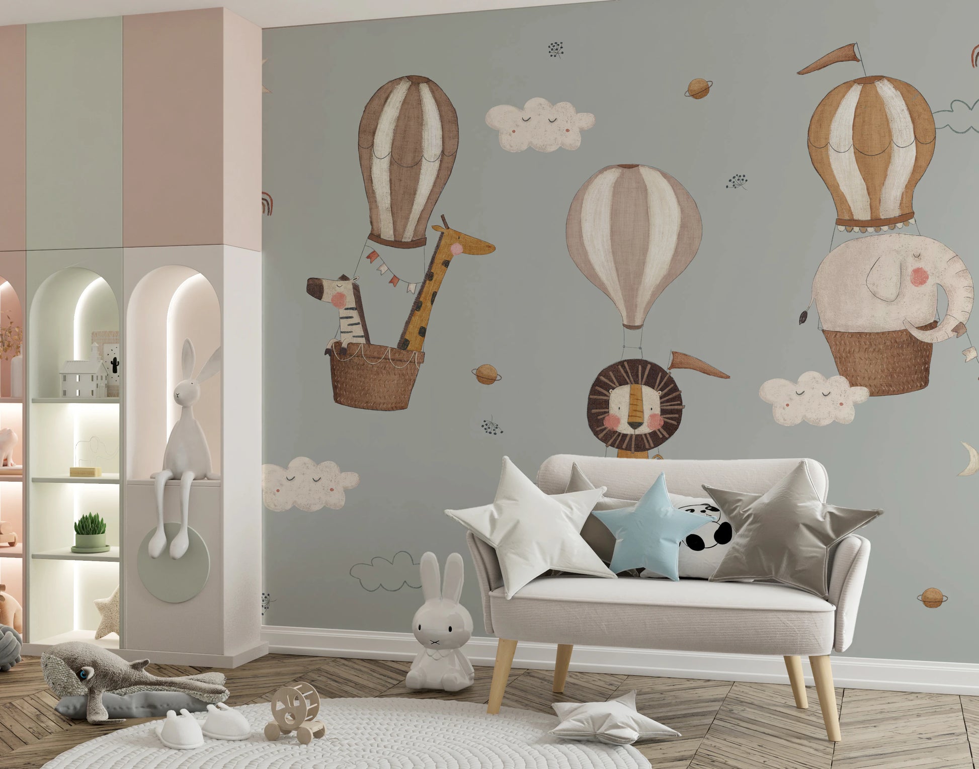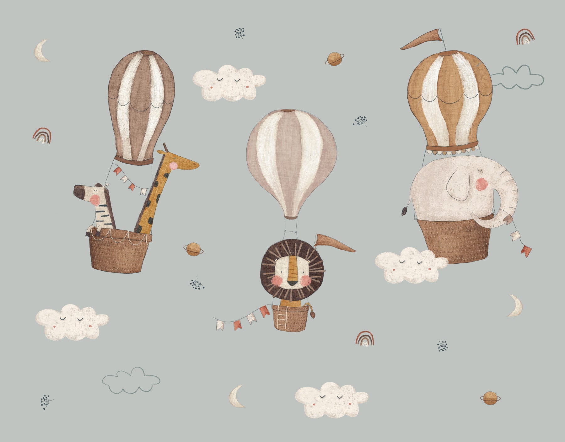 Intraprendi un viaggio fantasioso con questa incantevole decorazione murale "Mongolfiere per la cameretta dei bambini". Caratterizzata da un delizioso gruppo di simpatici animali che volteggiano in un cielo sereno a bordo di graziose mongolfiere, questa decorazione evoca un senso di meraviglia e avventura. Una giraffa e una zebra condividono una mongolfiera, mentre un leone e un elefante hanno ciascuno la propria. Nuvole delicate, piccole lune crescenti, pianeti e arcobaleni in miniatura fluttuano tra i palloncini, creando un'atmosfera rilassante e onirica, perfetta per la cameretta dei bambini. La palette di colori tenui e tenui e lo stile delicato delle illustrazioni donano un tocco di calore e giocosità a qualsiasi parete, trasformandola in un accattivante punto focale. Lascia che l'immaginazione del tuo piccolo prenda il volo con questa adorabile e commovente scena.