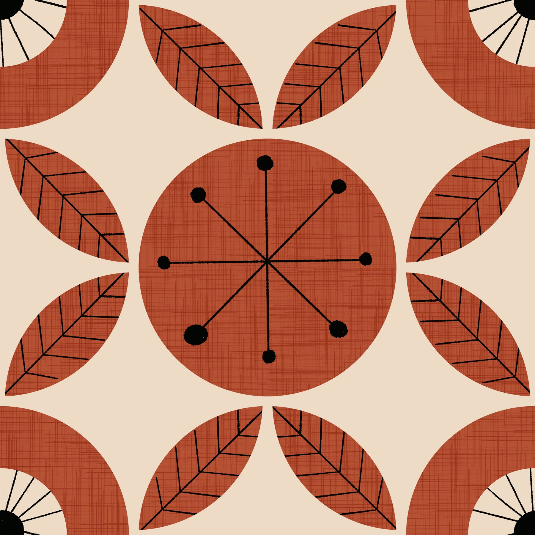 Geometric retro wallpaper with terracotta blooms surrounded by stylized leaf shapes.