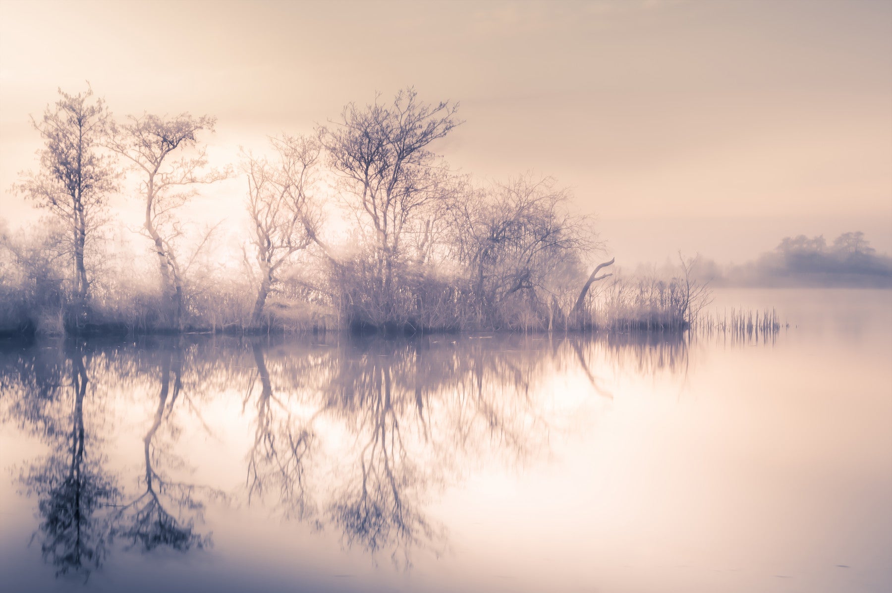Delicate light mural, blurry treeline over smooth water.
