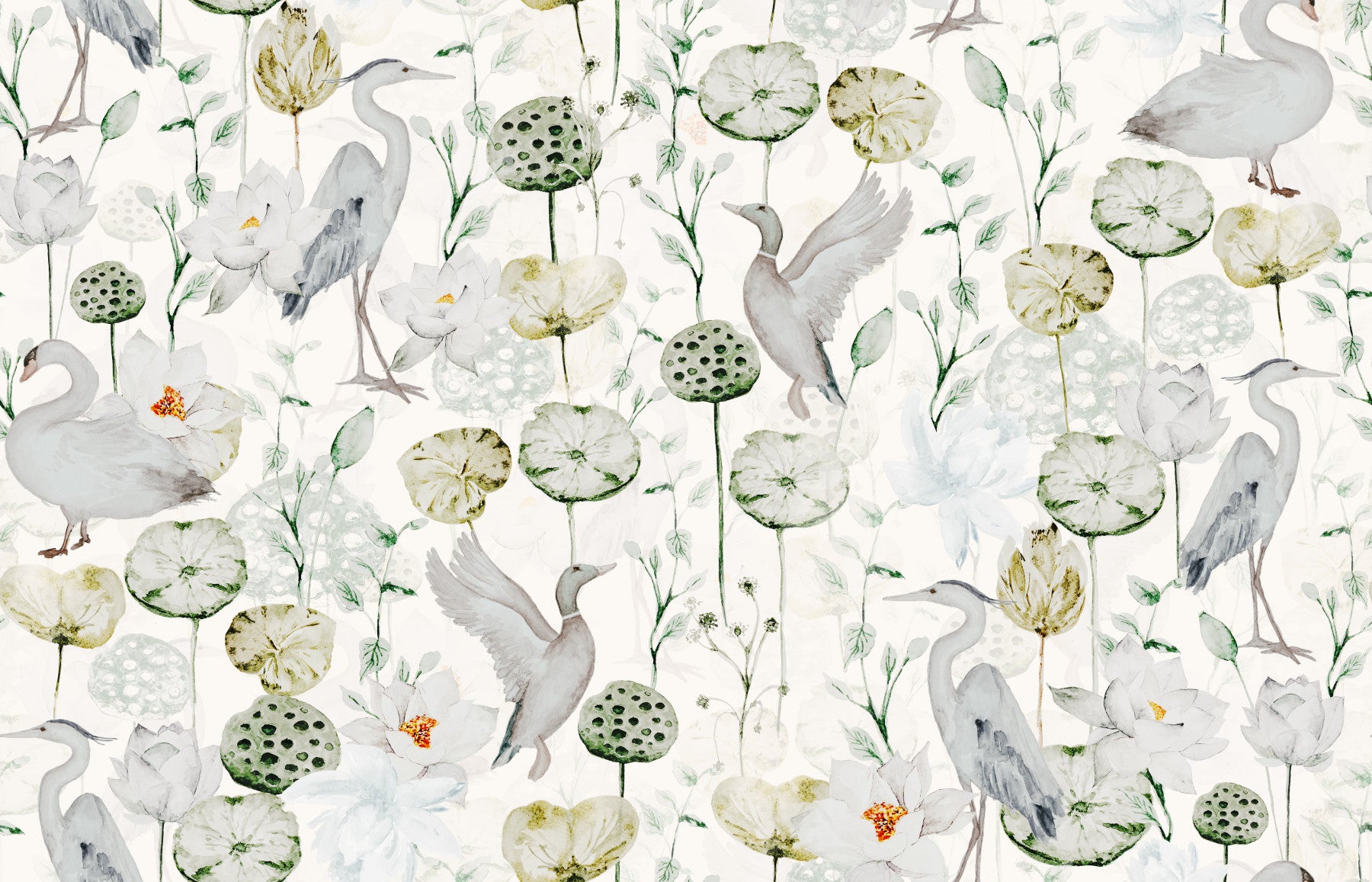 Water Garden Serenity wallcovering, graceful waterbirds, seed pods art.