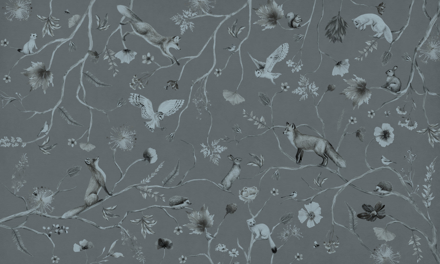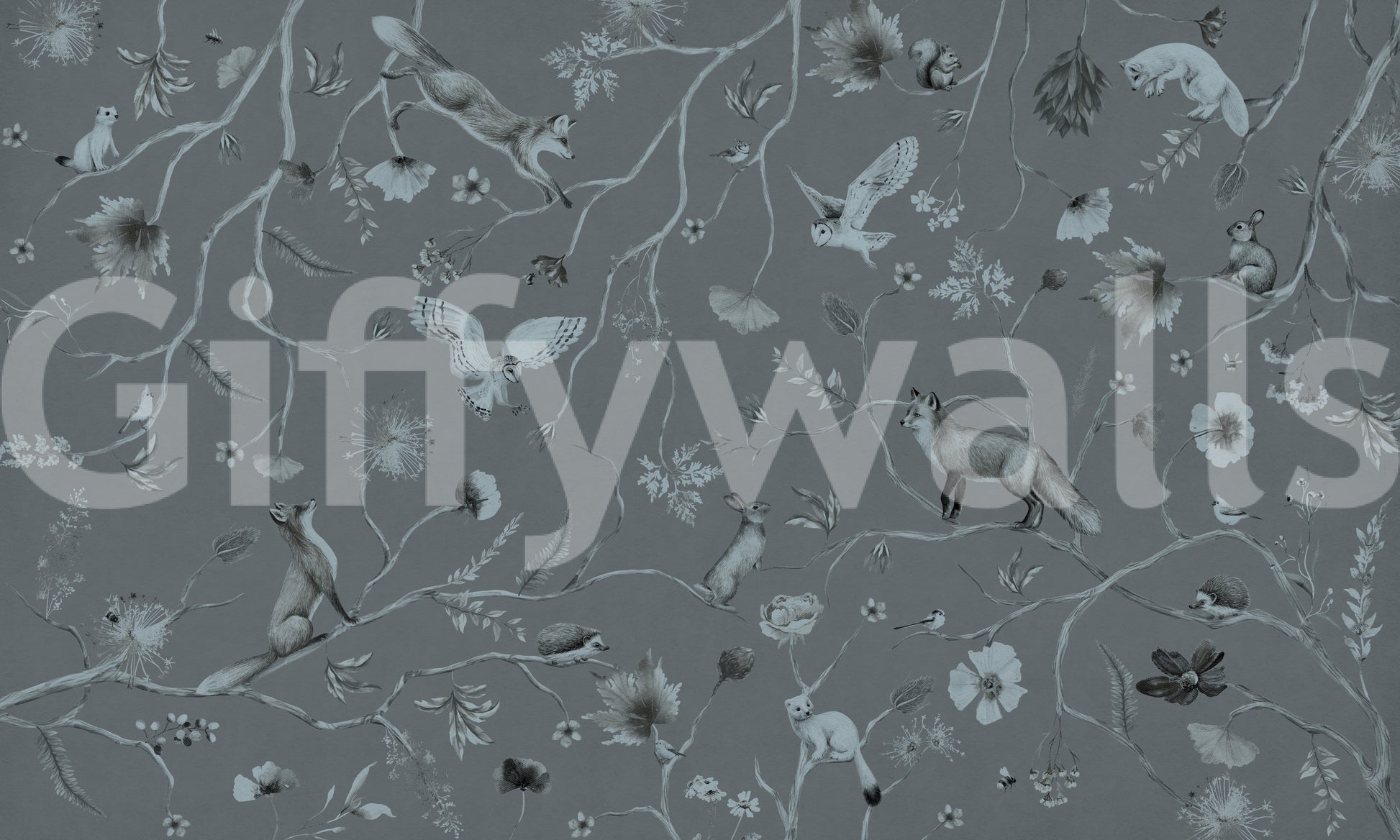 Invite nature indoors with this tranquil gray woodland design. The detailed illustration features foxes, owls, and squirrels among blossoming branches. This wallpaper for walls gives a sophisticated touch to living rooms, bedrooms, or nurseries. The muted color palette creates a serene and calming ambiance, easily complementing many interior styles. Transform any space into an enchanting woodland retreat with this soothing and stylish print.