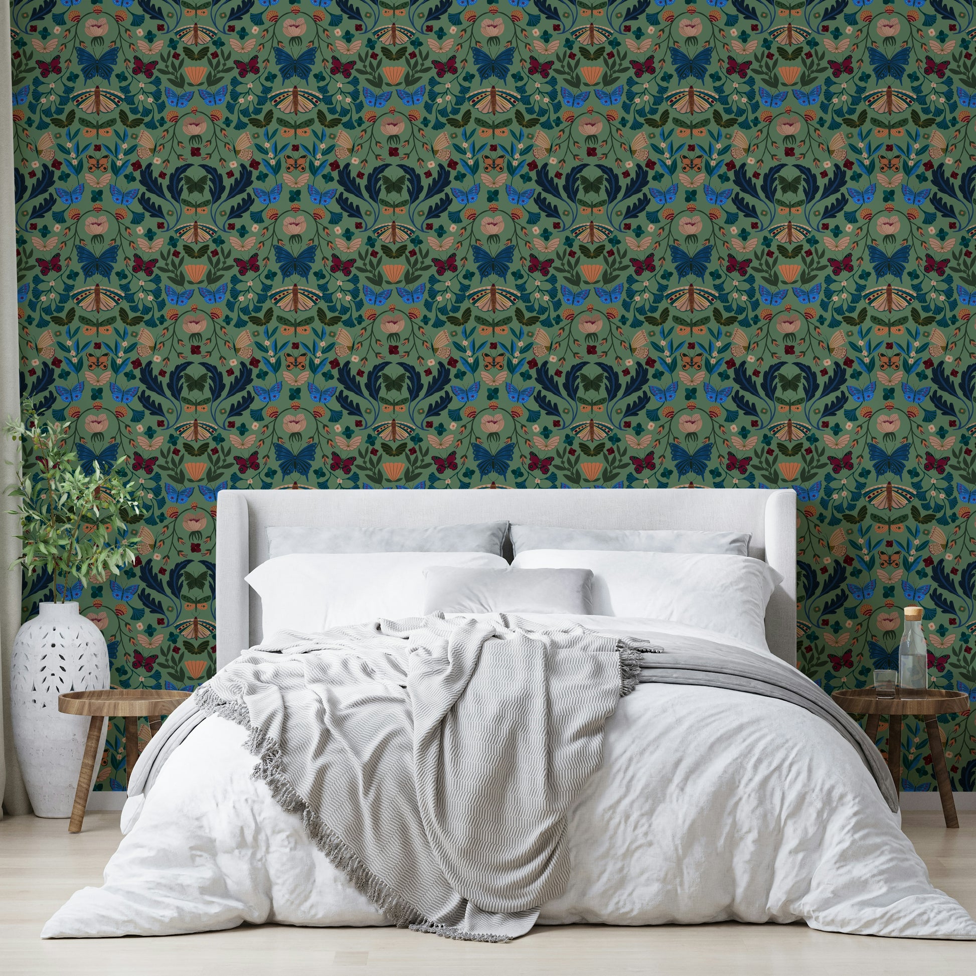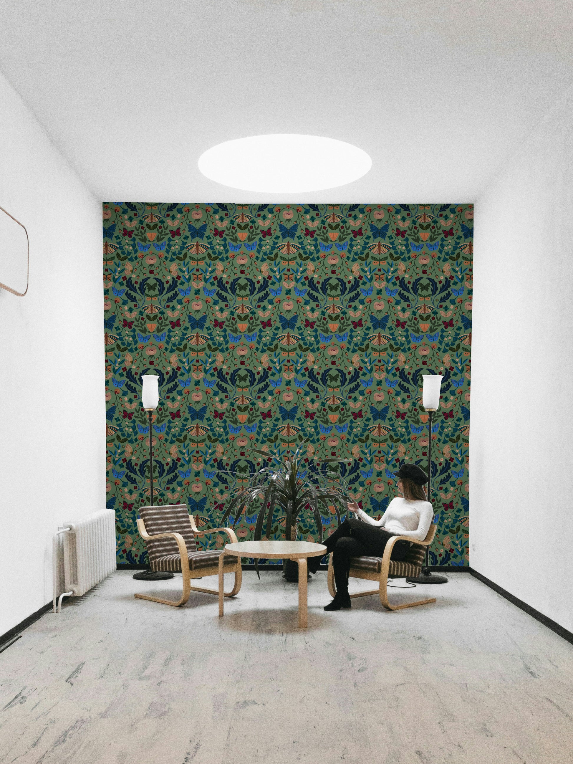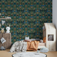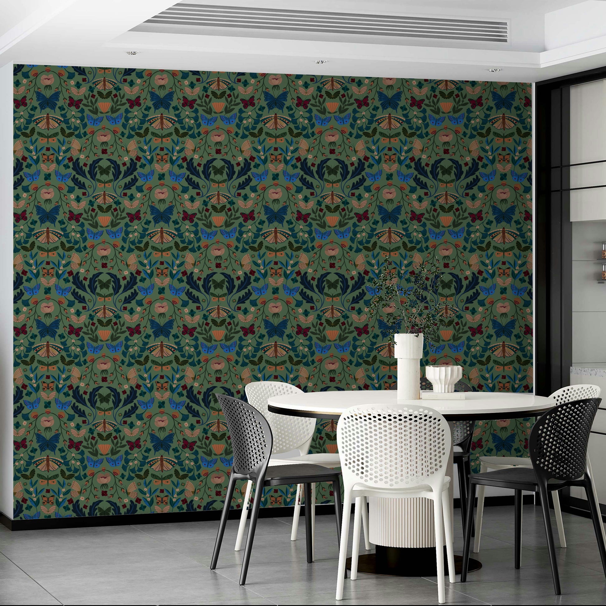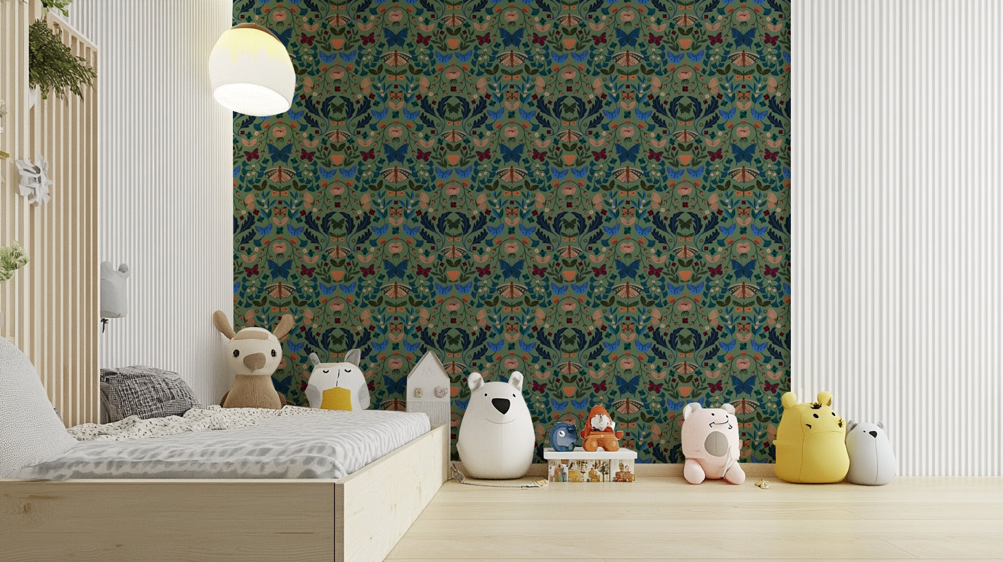 「フラッターフローラル」の魅惑的な世界に入ります。壁紙のデザインでは、鮮やかな蝶が様式化された花の豊富さの中で踊ります。 ディープブルース、ブルゴーニュ、オーカーの豊かな宝石のトーンは、塗装された各蝶と花の複雑なディテールを強調しており、心を落ち着かせる賢い緑の背景に沿って設定しています。 デザインの対称的な構成は、バランス感と静けさを生み出し、あらゆる空間に気まぐれな優雅さを追加するのに最適な選択肢になります。 複雑な花のモチーフと蝶の繊細な羽ばたきは、平和でありながら活気のある雰囲気を作るのに理想的な活気のある静けさの感覚をもたらします。