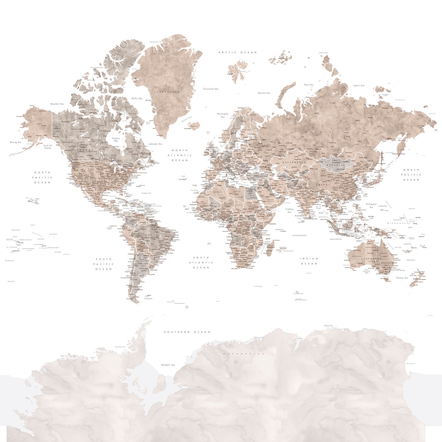 この壁紙は、美しい水彩スタイルでレンダリングされた詳細な世界地図を紹介しています。ミュートされたベージュとセピアのトーンは、ビンテージでノスタルジックな雰囲気を作り出し、あらゆる部屋に洗練されたタッチと旅行のインスピレーションを加えるのに最適です。 マップの複雑な詳細は、水彩効果によって柔らかくなり、落ち着いたロマンチックな雰囲気を与えます。地理と芸術的なデザインの両方に感謝する人に最適です。 微妙なカラーパレットは、モダンなミニマリストからクラシックな素朴まで、幅広いインテリアスタイルを補完することを保証します。