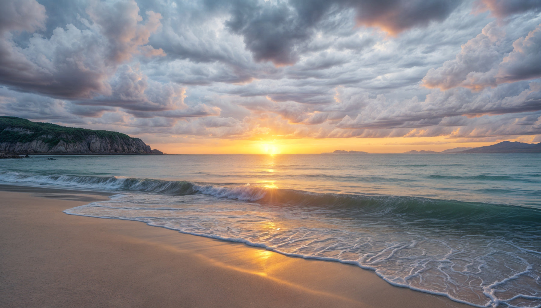 この穏やかな沿岸の日の出の壁紙で、海の鎮静効果をあなたの家にもたらします。金、青、ベージュの柔らかい色合いは、静かな雰囲気を作り出します。劇的な空の下で海岸にゆっくりと波。壁のこの壁紙は、寝室、リビングルーム、バスルームで美しく機能します。穏やかな風景のデザインは、近代的、ミニマリスト、または沿岸のインテリアを補完し、スペースをオープンで風通しの良いと感じさせます。毎日自然の美しさをお楽しみください。