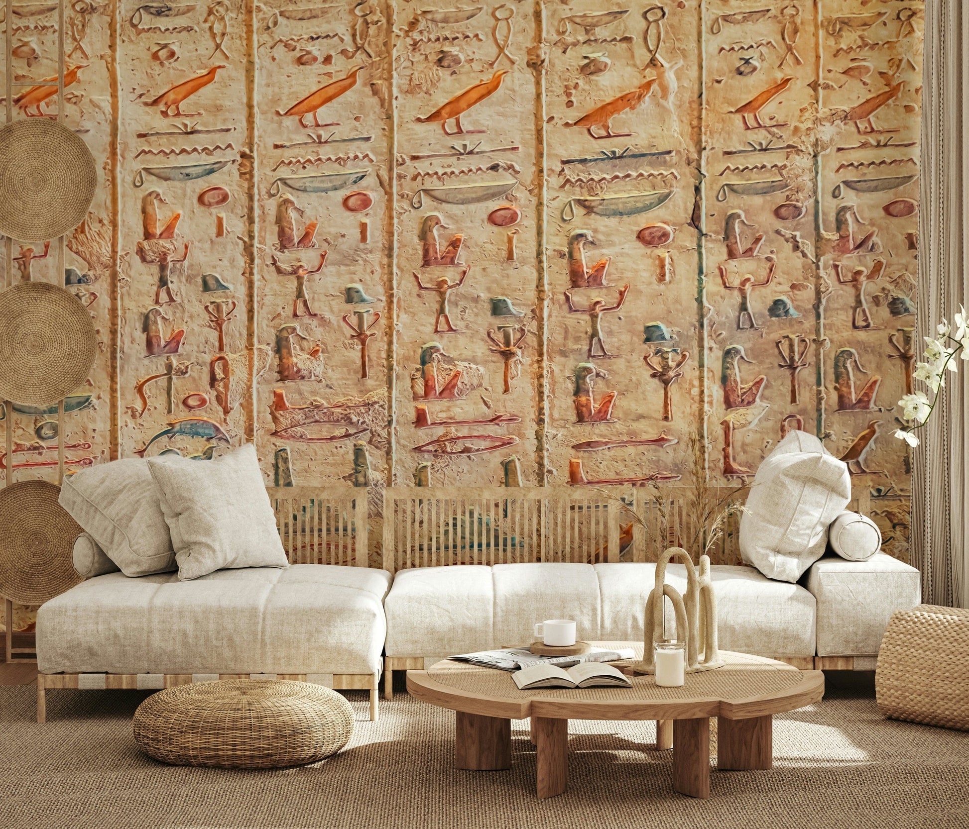 この印象的な壁紙で、古代エジプトの芸術性あふれる空間を演出しましょう。精巧に彫られた象形文字が、ご自宅に豊かな歴史と神秘の雰囲気をもたらします。温かみのあるアースカラーと、赤と青の繊細なアクセントが、古き良き時代の趣を醸し出します。この精緻な模様は、どんなお部屋も魅惑的な安らぎの空間へと変貌させます。リビングルーム、書斎、玄関ホールに、考古学的な魅力を添えて、ワンランク上の空間を演出しましょう。精巧なディテールと歴史的な関連性が、この壁紙を真にユニークで魅力的なインテリアに仕上げています。空間に個性と深みを与えるのに最適です。
