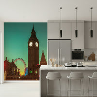 View of Big Ben from street, London, UK. Adorn your space with "City Timepiece," an evocative art piece that captures the majestic essence of London at twilight. The iconic silhouette of Elizabeth Tower, affectionately known as Big Ben, dominates the scene, its illuminated clock face a beacon against the serene teal sky. Beside it, the graceful arc of the London Eye paints the skyline with a delicate dance of light and shadow. This piece encapsulates the rhythm and pulse of urban life, where history and modernity intertwine. The warm glow emanating from the clock and the vibrant hues of the distant cityscape create a captivating ambiance, perfect for adding a touch of sophisticated charm to any room. Let this artwork transform your wall into a window overlooking a timeless metropolis, a daily reminder of enduring elegance and the ceaseless passage of time.