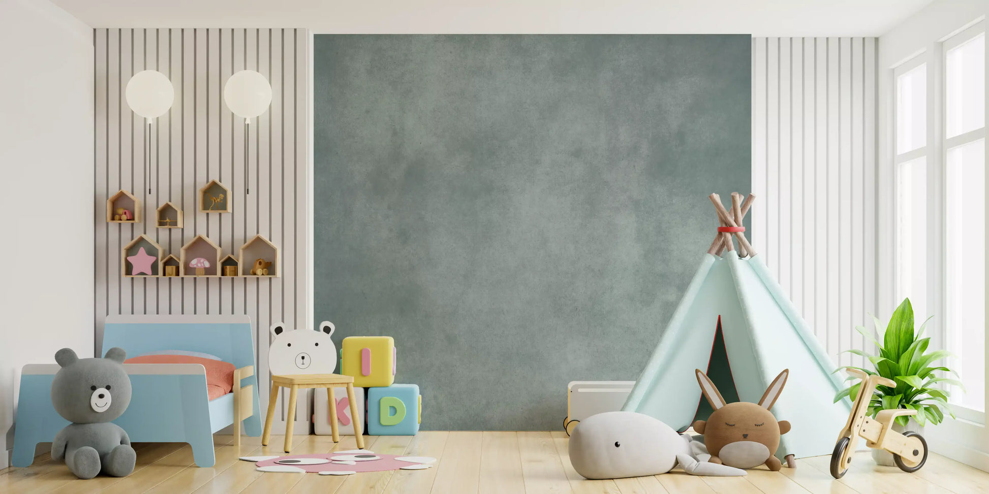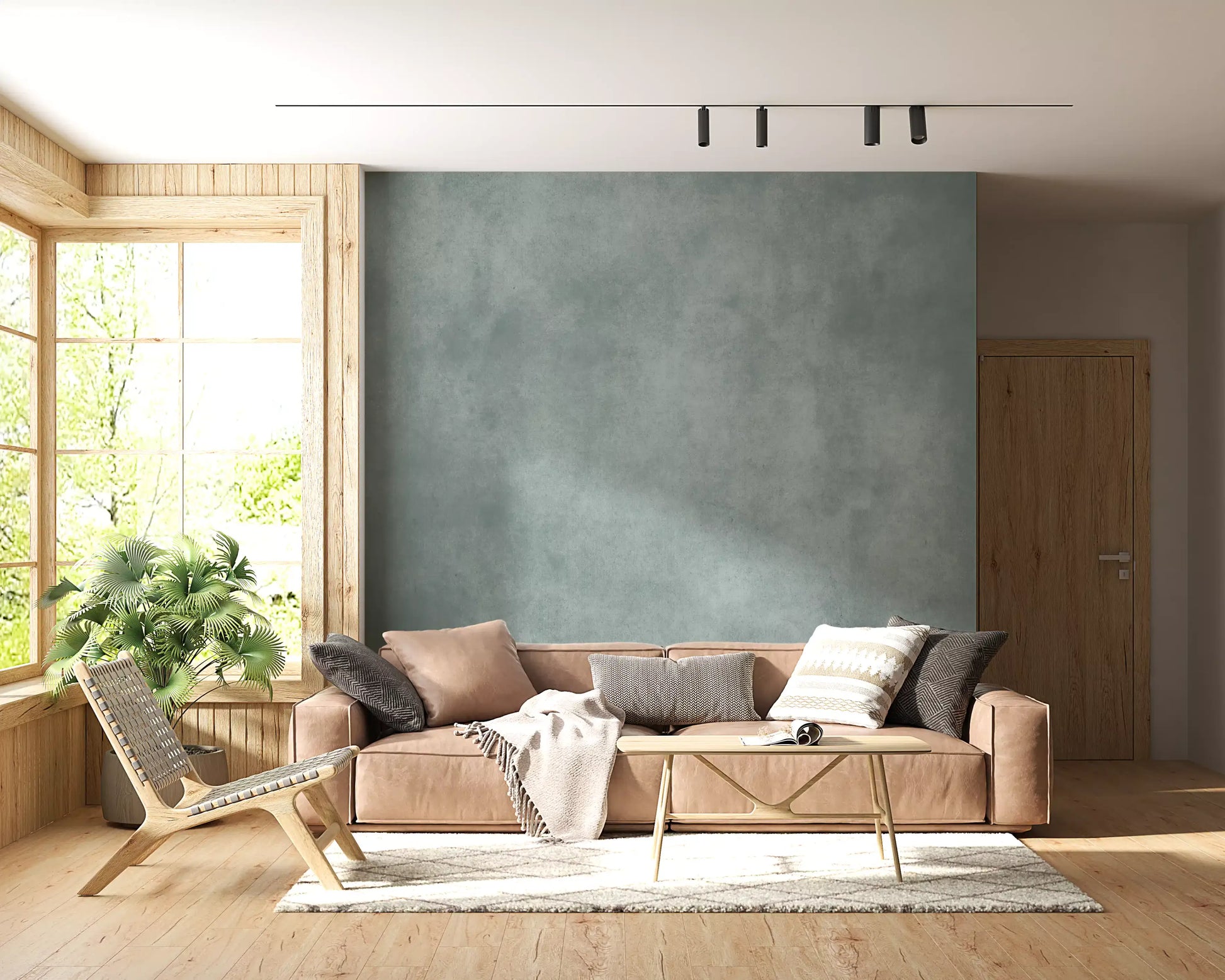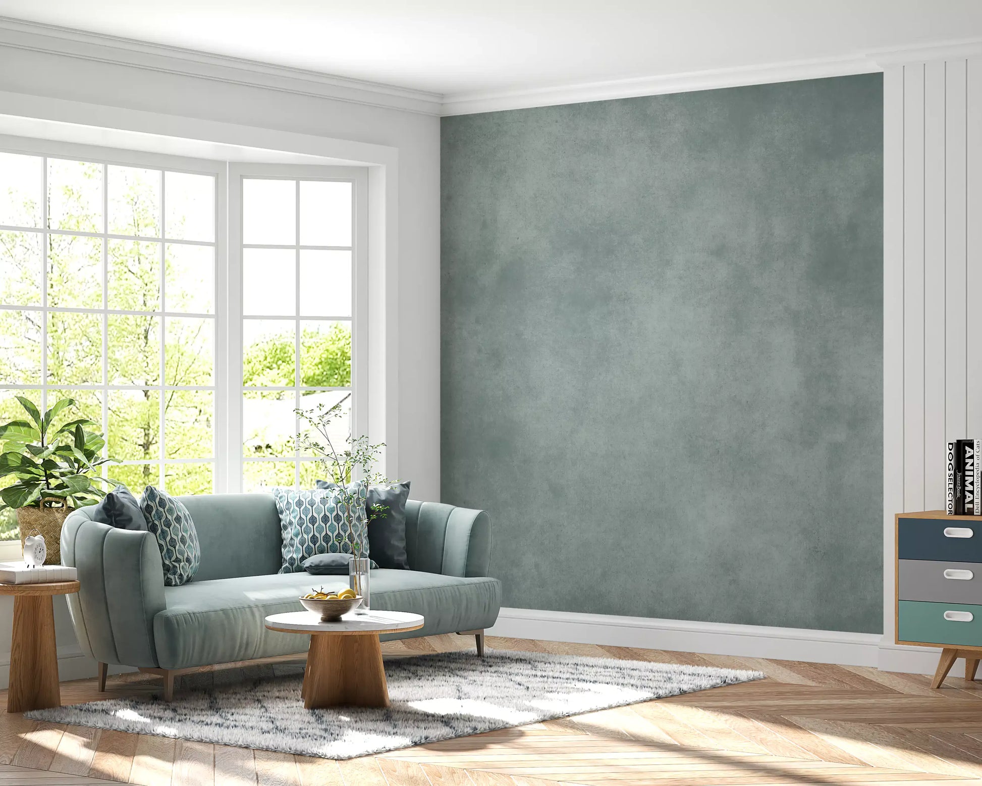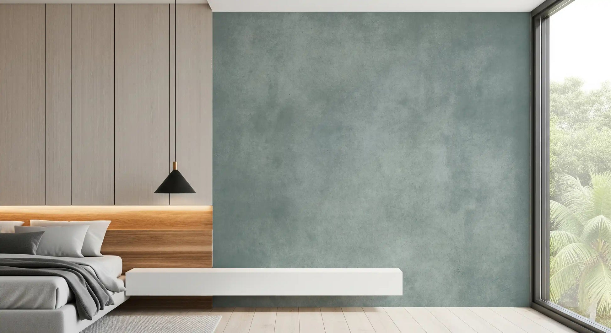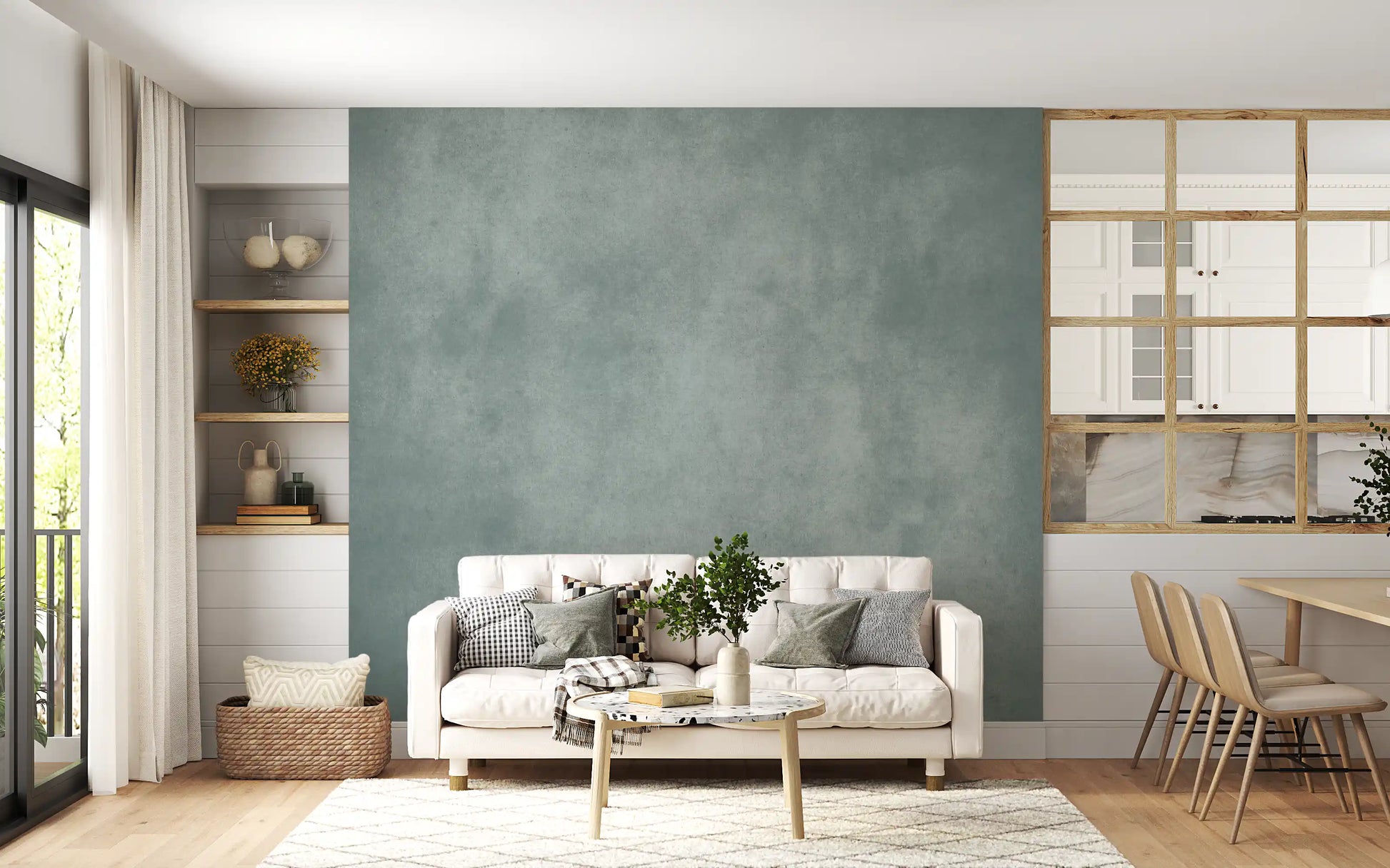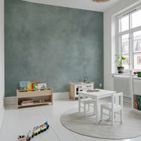 Dirty Paper - Poolは、青緑色とクールグレーの柔らかくまだらなウォッシュが施された、落ち着いた質感の壁紙です。まるで古びた紙や軽く風化した漆喰の壁のような雰囲気を持っています。控えめな斑点や曇りがかった色の変化が深みを加えつつも、煩わしさを感じさせず、生活に馴染みやすい穏やかなテクスチャーです。このウォールミューラルは、モダン、ミニマリスト、コースタル、インダストリアルなインテリアデザインに適しており、寝室、浴室、ホームオフィス、廊下など、アートや木の色合い、またはシャープな白い家具の静かな背景として最適です。