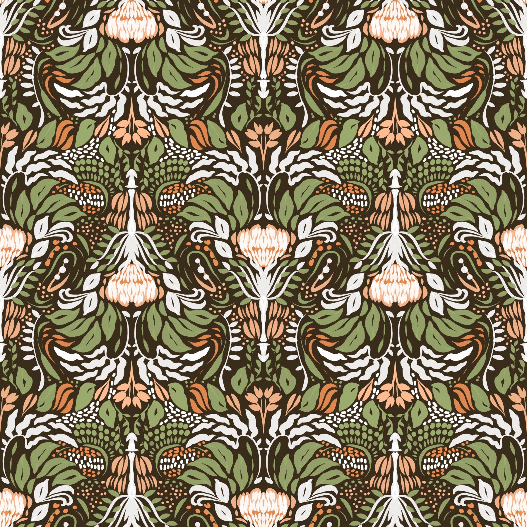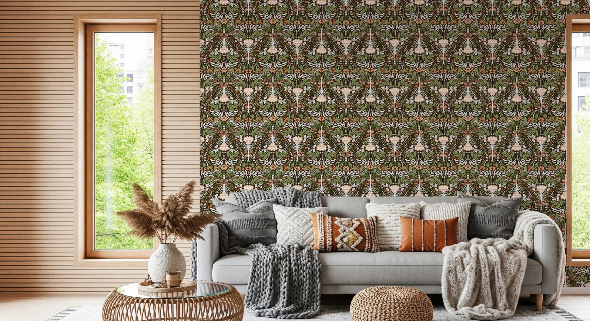 この洗練された壁紙は、豊かで有機的なパターンでどんなインテリアも変身させます。深みのあるアースブラウンの背景が、温かみのある基調を作り出し、スタイライズされた植物の要素を引き立てます。豊かなセージグリーンの葉、柔らかなピーチの花、繊細なクリーム色のアクセントが魅力的なリピートデザインで絡み合います。手描きの筆遣いスタイルがそれぞれのモチーフに職人の魅力を与え、アーツ&クラフツの美学が持つ時代を超えた優雅さを呼び起こします。このデザインは穏やかで居心地の良い雰囲気を作り出し、くつろげるリビングルーム、静かな寝室、または上品なダイニングエリアに最適です。素朴で伝統的なインテリアのどちらにも完璧に調和し、自然の美しさと洗練された深みを壁に加えます。この魅力的なパターンを取り入れて、洗練された自然の魅力を空間に吹き込み、簡単にお住まいの美観を高めましょう。