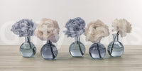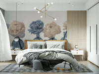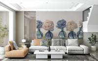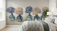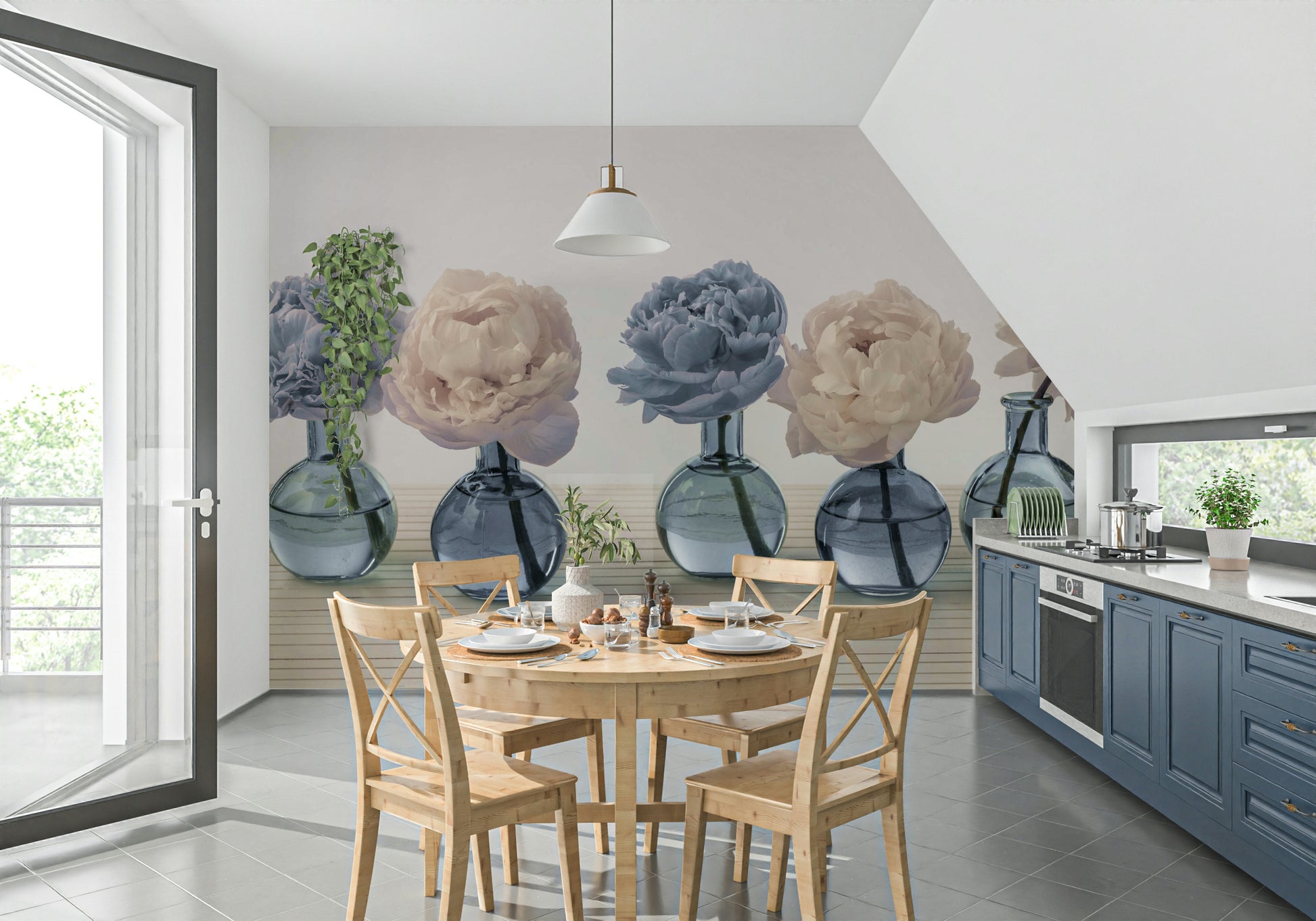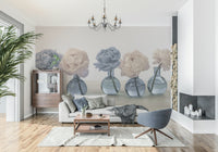 Peonies in glass bottles. Infuse your space with the subtle grace of this peony themed wallpaper for walls. The design features delicate peonies in clear glass vases. The soft blues and creamy tones create a refreshing and sophisticated visual effect. This design effortlessly elevates bedrooms, living rooms, dining areas, and even home offices. It blends well with modern and classic interiors, adding a layer of simple sophistication. Transform your walls with the serene charm of nature. The gentle color palette and understated floral imagery ensure a seamless addition to any interior aesthetic, adding a touch of tranquility.