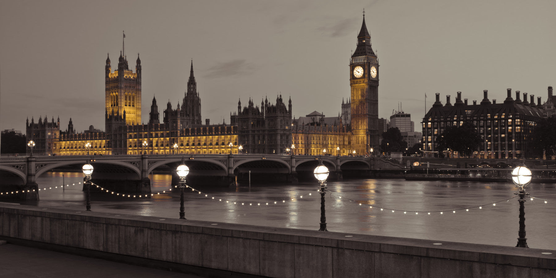 国会議事堂を描いたこの魅惑的な作品で、時代を超えた優雅さを演出しましょう。夕陽の温かみのある輝きに包まれた、この象徴的な建造物と荘厳な時計塔ビッグベンは、人々の視線を釘付けにします。このランドマークの建築的壮麗さと歴史的意義を捉えたこの作品は、テムズ川の穏やかなきらめきによって和らげられています。ライトアップされた街灯と繊細なストリングライトが水面に反射し、静謐で趣のある雰囲気を醸し出します。どんなお部屋にも洗練された雰囲気を添えるこの作品は、歴史、文化、そしてさりげないラグジュアリー感を空間にもたらします。