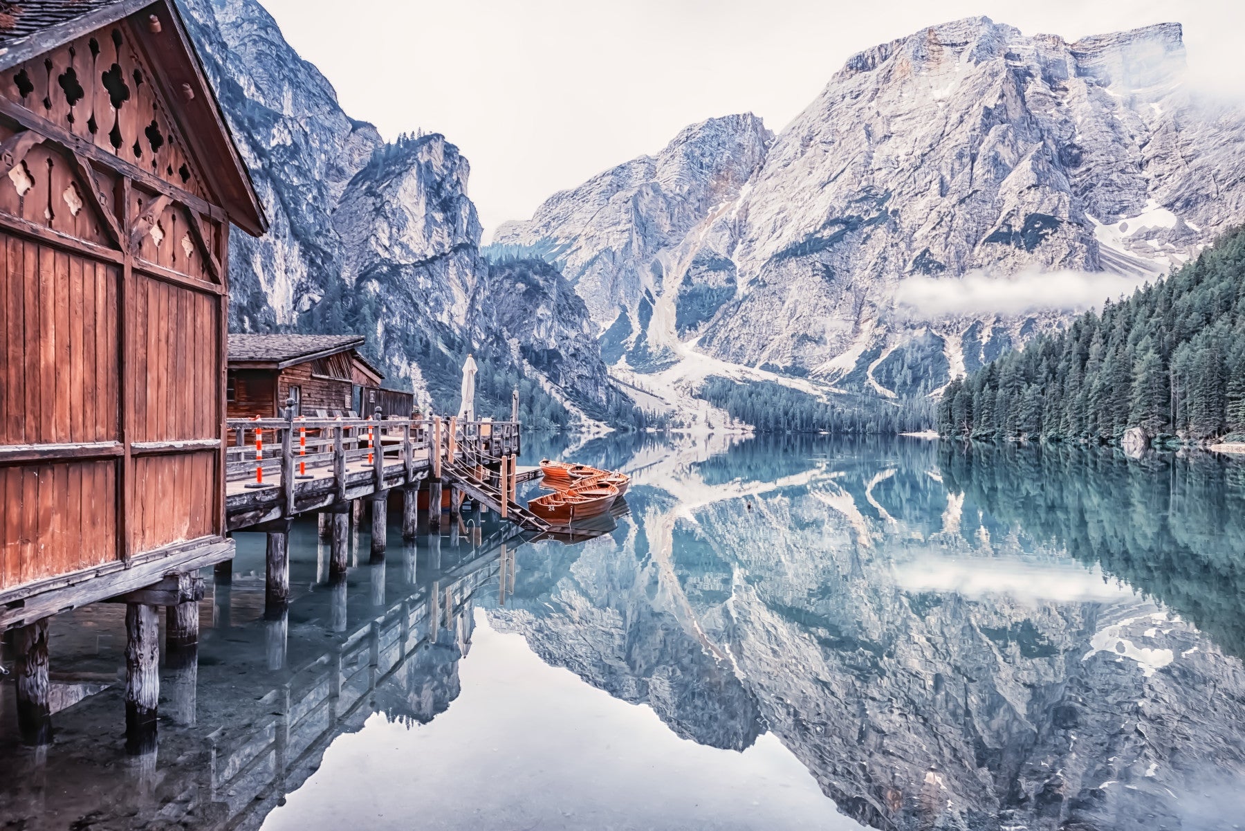 Alpine boathouse lake mirror Lago di Braies Reflection wallpaper