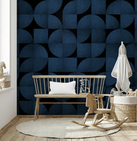 'Mid-Century Blue Stone' - This wallpaper features a captivating geometric pattern of circles and squares, rendered in a deep, textured blue reminiscent of honed stone. The interplay of positive and negative space, accentuated by the bold black background, creates a visually striking statement piece. The design draws inspiration from the era's fascination with clean lines and abstract forms, adding a sophisticated and retro-chic touch to any room. The subtle texture adds depth and visual interest, mimicking the natural variations found in quarried stone. Embrace a harmonious blend of vintage charm and contemporary style with this unique and eye-catching design, perfect for creating a stylish focal point in your living room, bedroom, or office.