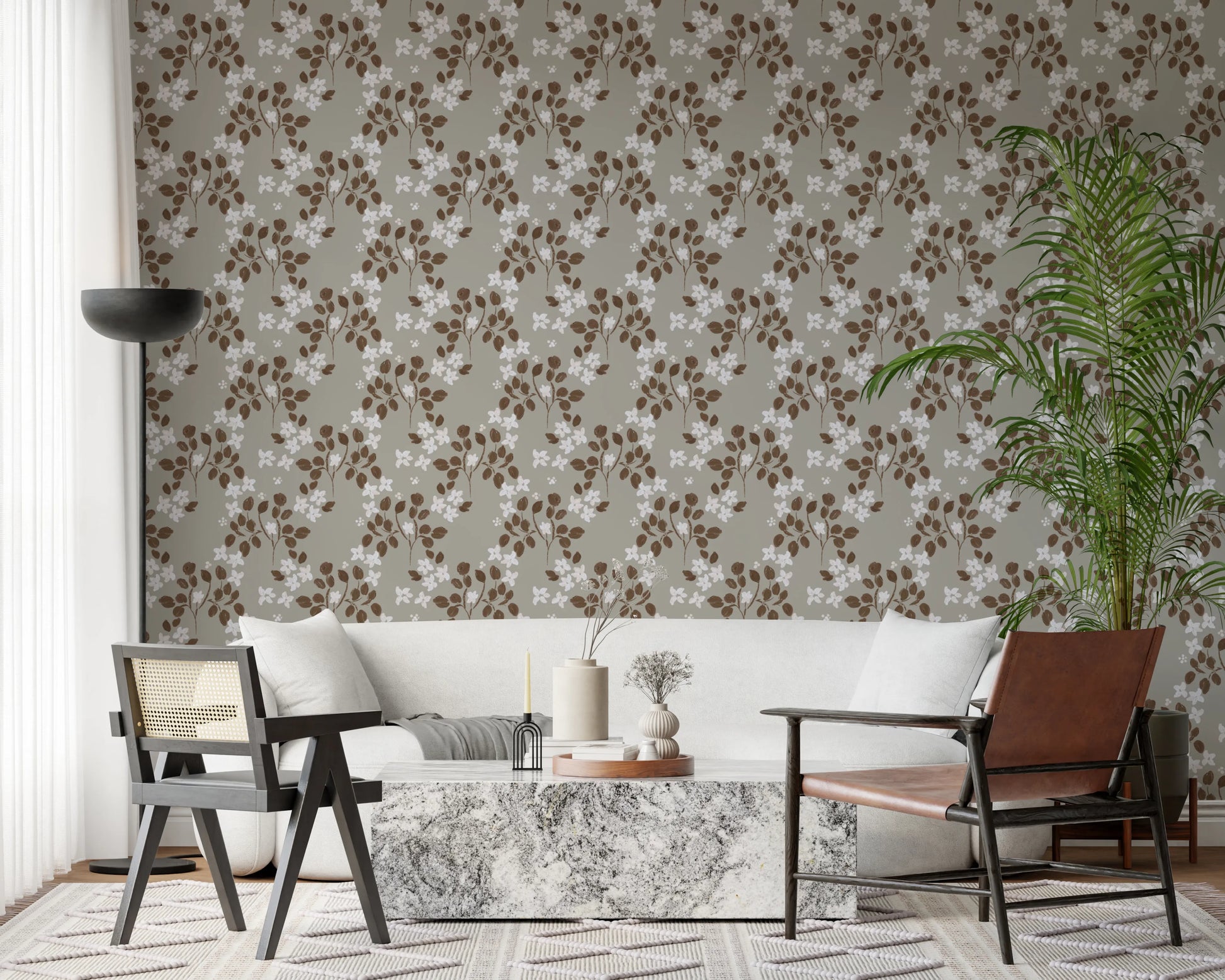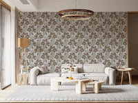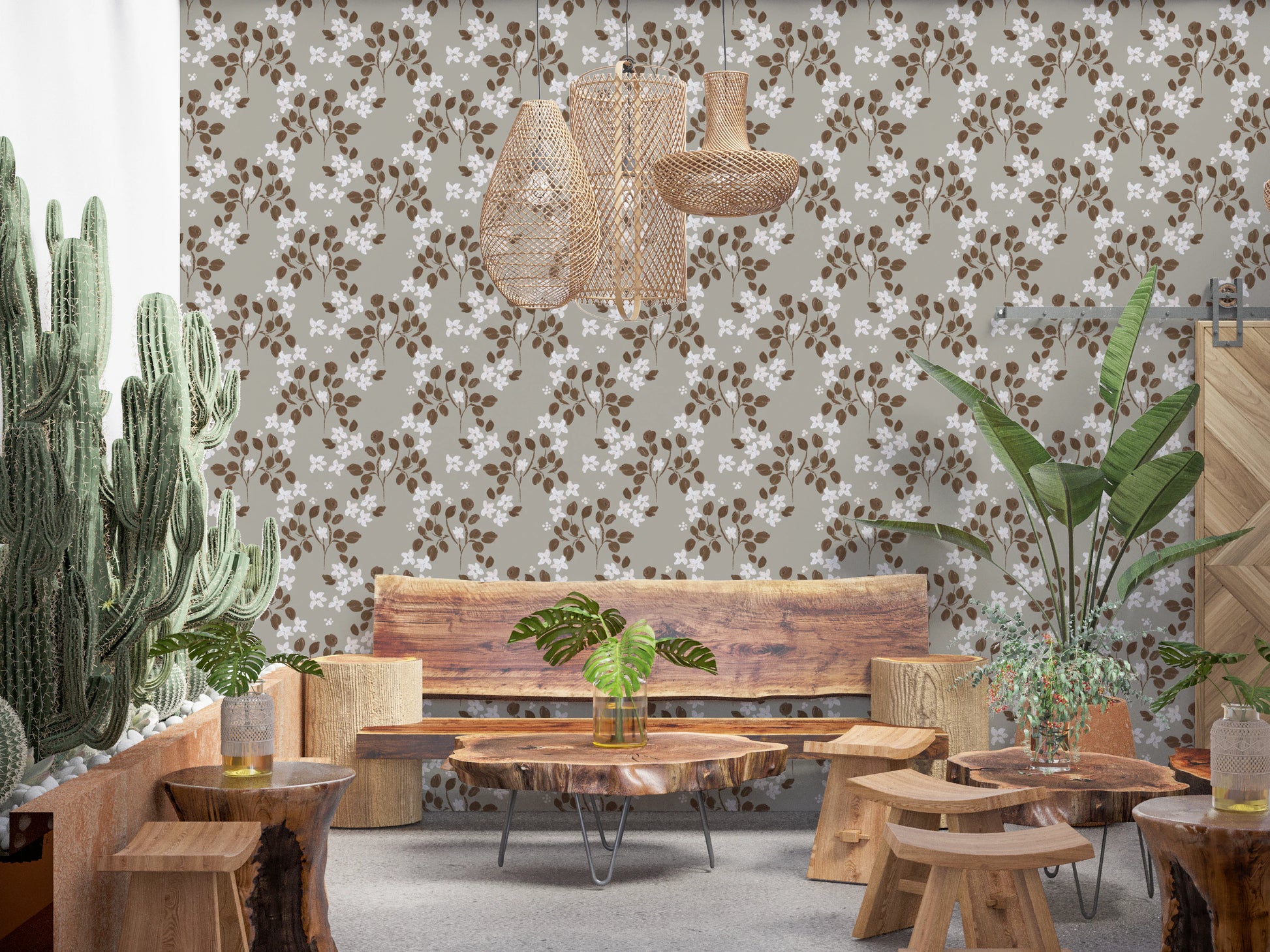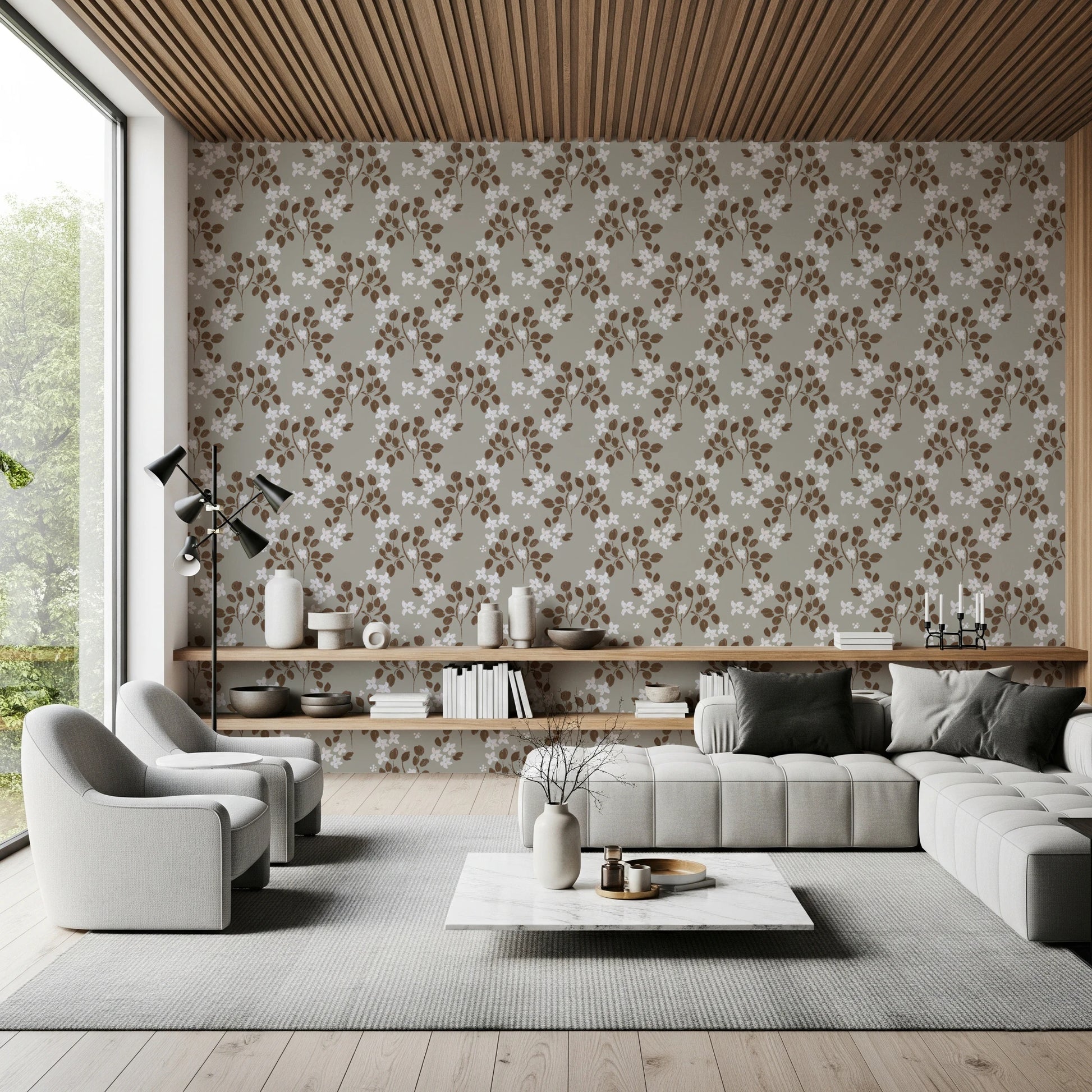 この魅惑的な花柄で、ご自宅にさりげないエレガンスを添えてみませんか。シンプルながらも洗練されたパターンは、落ち着いたニュートラルな背景に、繊細な白い花とココアカラーの葉を際立たせています。寝室、リビングルーム、廊下など、落ち着いた雰囲気を演出するのに最適なこの壁紙は、落ち着きと洗練された雰囲気を醸し出します。手描きの美しい模様が芸術的な魅力を放ち、モダンなインテリアスタイルにも伝統的なインテリアスタイルにもマッチする万能な選択肢です。自然光を取り込み、さりげない視覚的効果を加え、壁を静謐な美しさのキャンバスへと変貌させます。