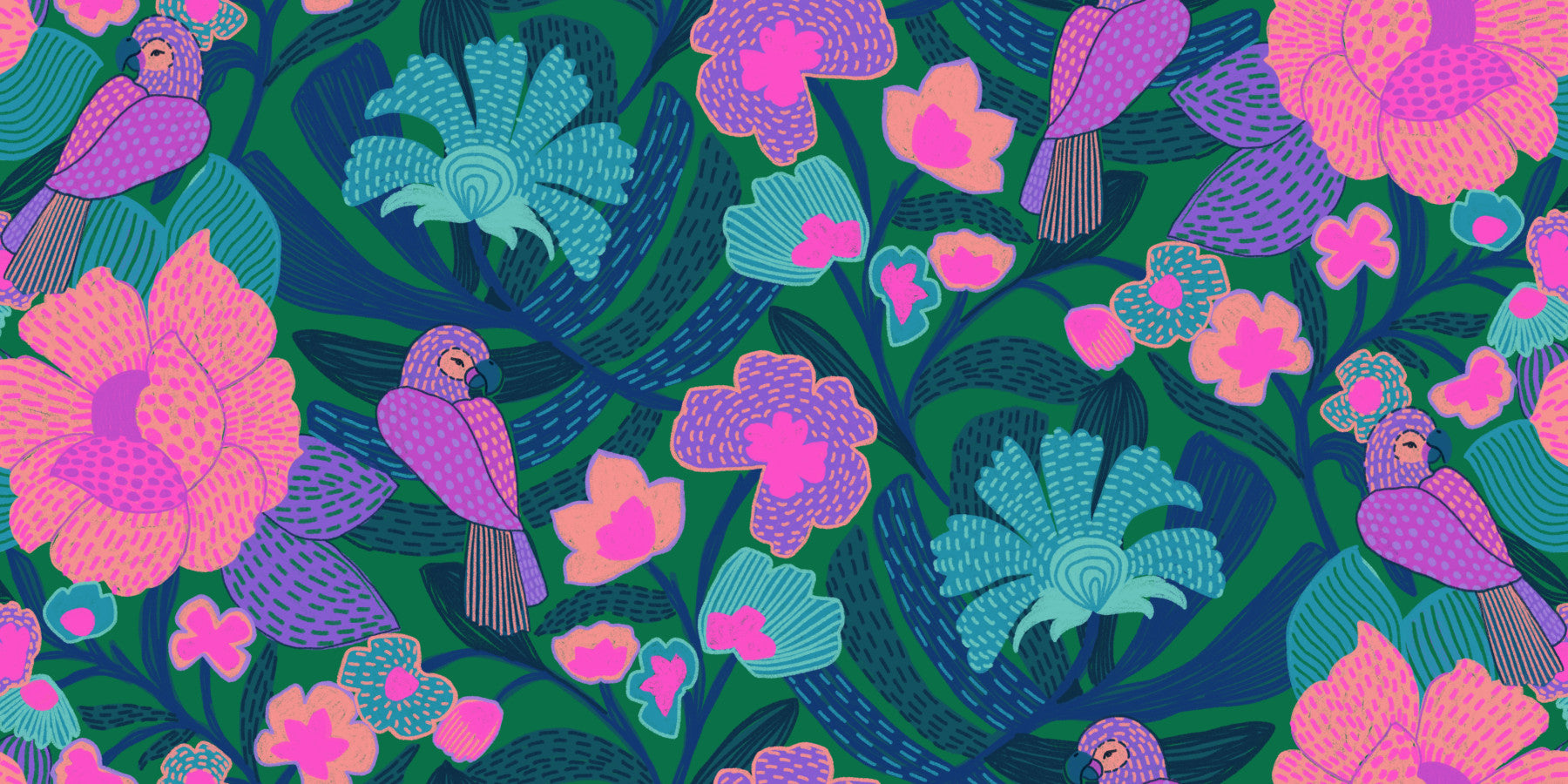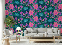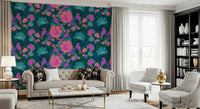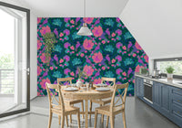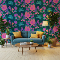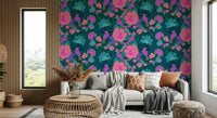 Transform any interior with this lively parrot and floral design. The playful arrangement features vibrant flowers in pink, peach, and turquoise, complemented by whimsical parrots. Bold, stylized leaves in navy and dark green create depth and visual interest. The design brings a touch of the jungle into the home. Introduce this wallpaper for walls to bring energy and charm to living rooms, bedrooms, or children's spaces. It works well as a feature wall or across an entire room, adding a playful, artistic element.