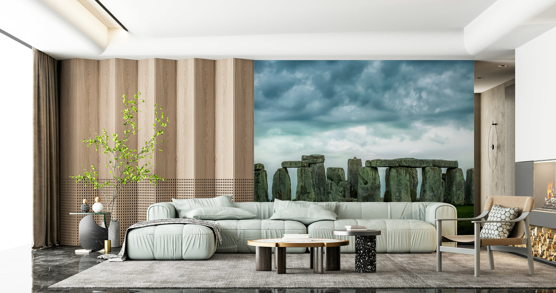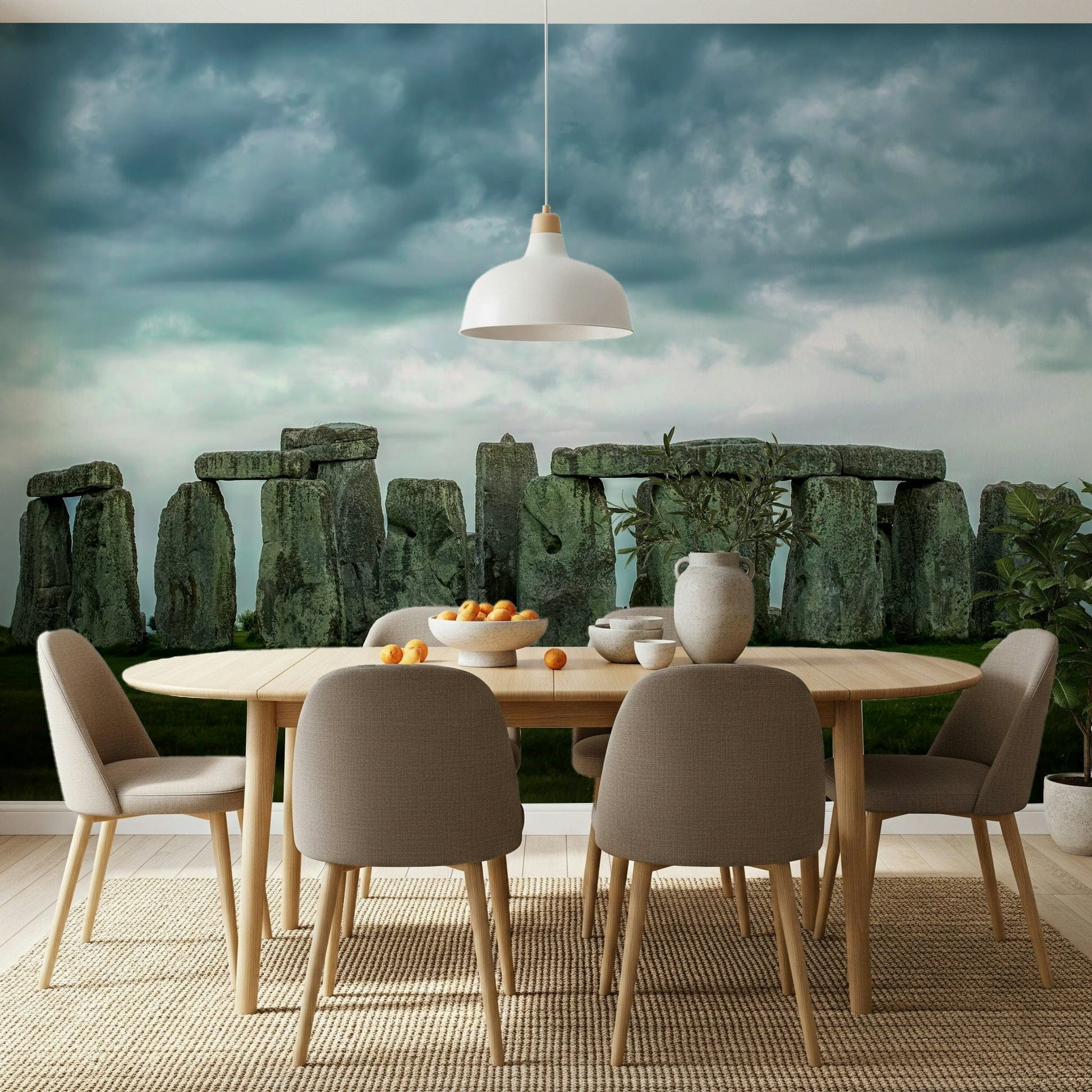 Embrace history with this captivating Stonehenge wallpaper for walls. The image showcases the iconic stone circle under a dramatic sky, creating a sense of ancient mystery. Its neutral tones of gray and green blend easily with various interior styles, from modern to rustic. Consider this for a study, living room, or hallway. The design adds a focal point that sparks conversation and infuses the space with a sense of wonder and timelessness.